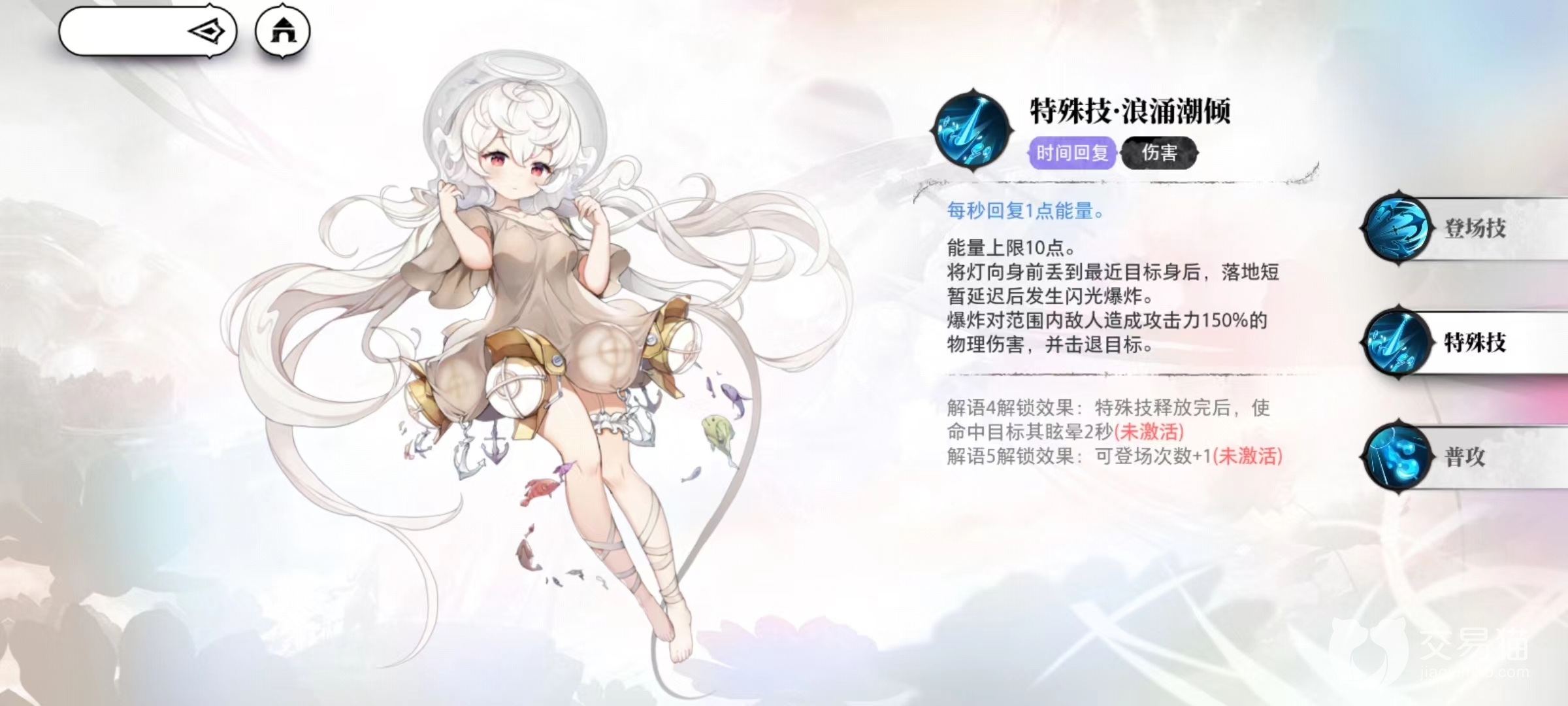 特殊技能浪涌潮倾,每秒都能回复自身1点能量,能量上限10点,将手中灯朝着身前距离最近目标身后,在落地之后短暂延迟发生闪光爆炸,爆炸可以对范围内敌人造成物理伤害,并且将目标击退。如果能够控制好释放位置,也能够合理利用击退所带来的优势,通过解语解锁之后额外效果为特殊技释放完毕后,会令目标额外眩晕两秒钟,还有额外增加1点登场机会效果。