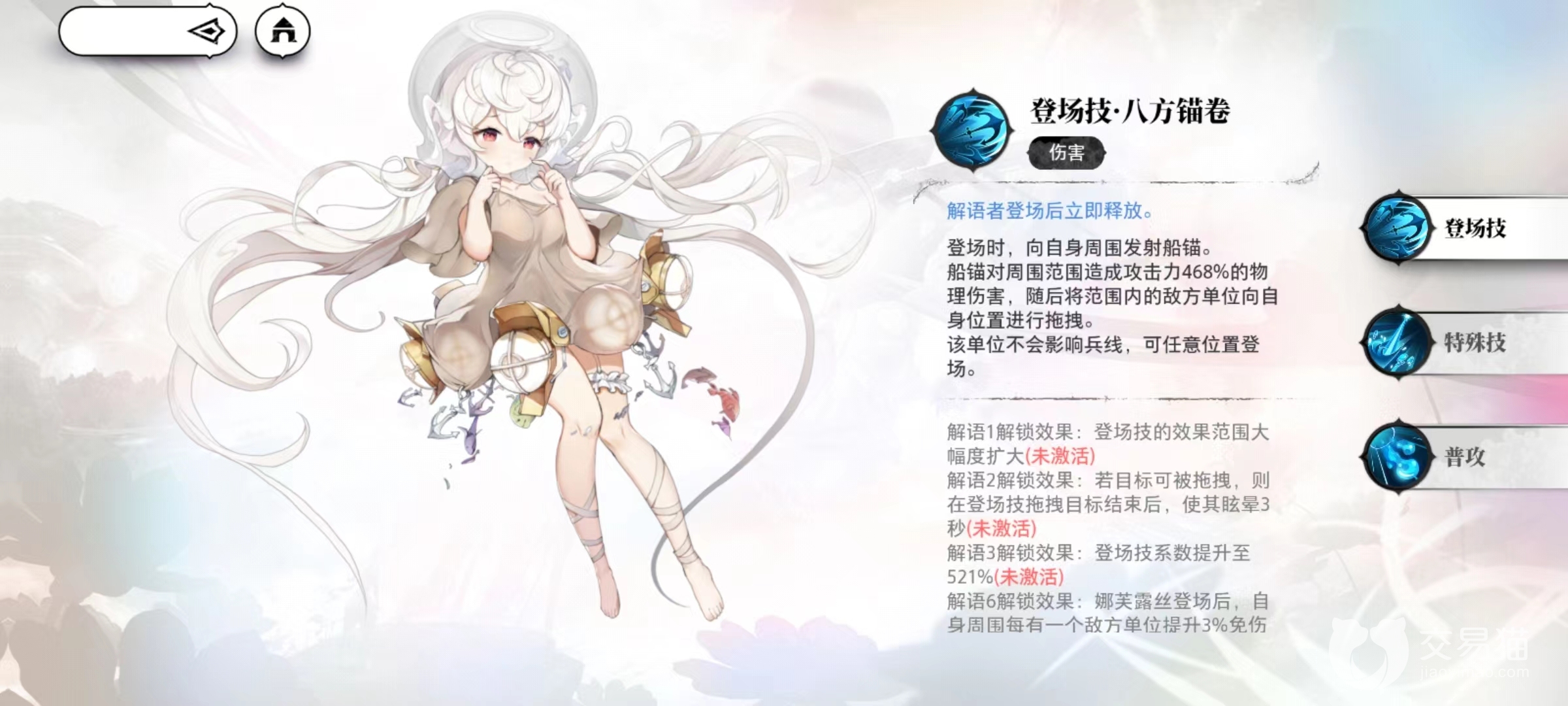 普攻技能召唤出来之后对目标进行物理伤害输出。登场技在召唤之后立即发动,对自身周围释放出船锚。这些船舶可以对周围范围内的目标进行高额物理伤害,并且将所有攻击到敌方单位向自身位置进行拖拽,这样起到强制位移作用。在很多防守类型的战斗中,如果对方敌人位置比较危险,那么就可以利用这一技能将它们直接拽回来,减少受到的伤害。
