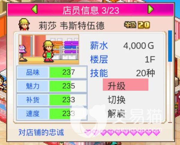 就拿店员莉莎来说,首先第一个是品味,它会直接影响货柜的人气,员工品味要是好,那么他在摆放货物的时候位置就会特别好,就会吸引更多的人来进行购买。品味要是低,摆放的位置可能就并不是特别好,就会导致客人不愿意购买该货柜上的东西。