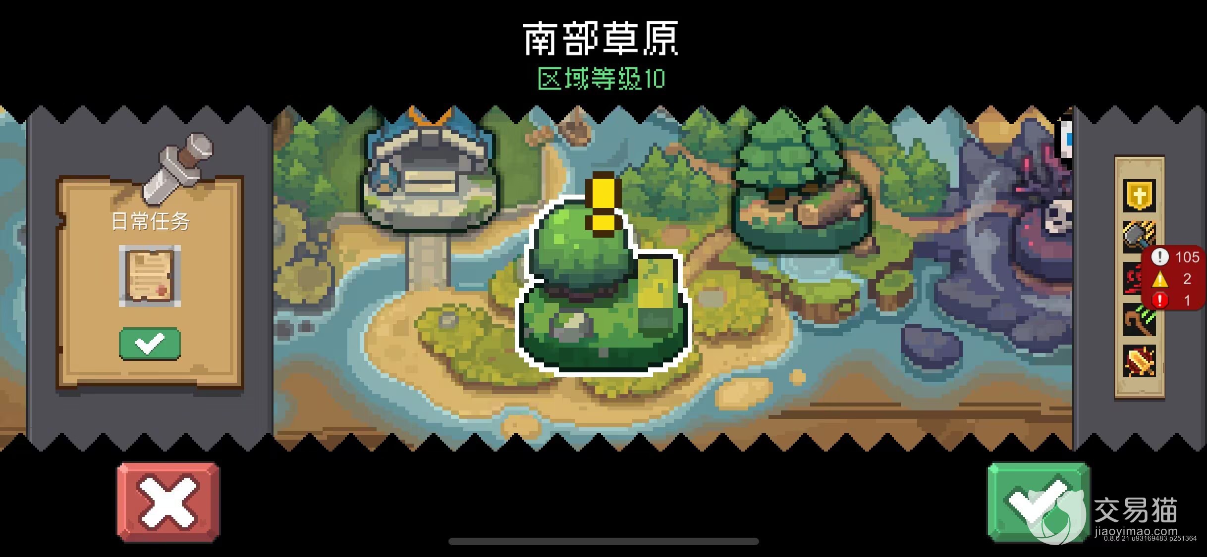 南部草原:这块区域分布着很多草甸,草甸附近有野猪和土狼士兵等怪物,这些怪物具有较强的攻击性,见到玩家后会发起主动攻击,不过它们的实力对于玩家来说十分的不堪一击,也就是最后的boss野猪王有一定挑战性,它具有冲撞和泰山压顶两种技能,不过都可以通过观察前摇动作轻松躲避。