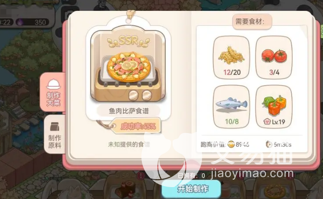 食谱制作的时候是没有办法进行加速的,而制作菜品和制作材料的时候,没有达到要求的等级时,只能制作基础材料。制作菜品也是分失败和成功的,而成功率主要取决于原材料的投放,如果拥有足够的材料,那么成功率肯定是100%。当然如果玩家们成功率没有达到的话,也可以使用一些小动物来提升成功率!