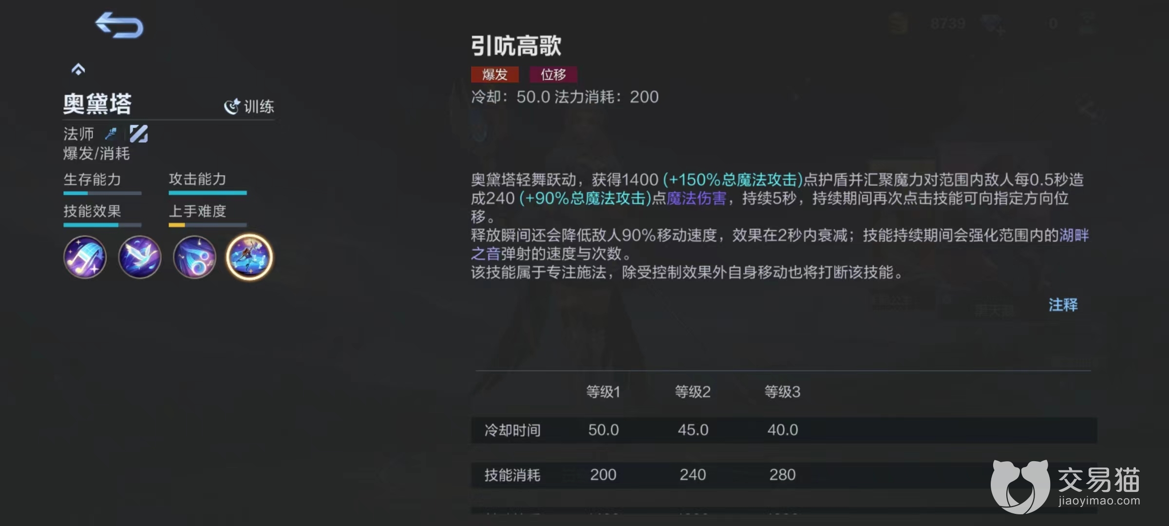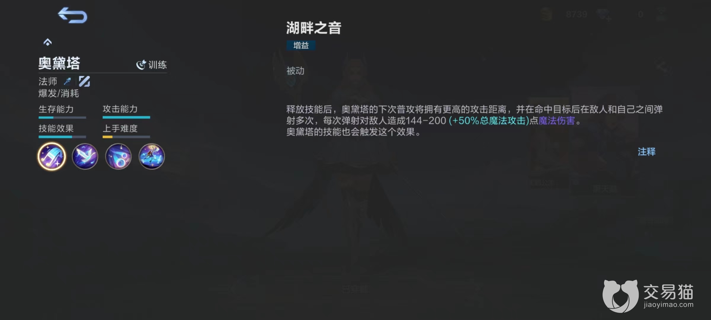 被动技能湖畔之音,释放技能后奥黛塔下次普攻拥有更远输出距离,同时在命中目标后将会在敌方多个目标之间进行弹射,每次弹射都能造成魔法伤害,技能也可以触发这一效果。该被动可以成为在线上消耗时非常有用的手段,或者是快速将小兵清理掉,这些都有利于中路进行战术发挥。