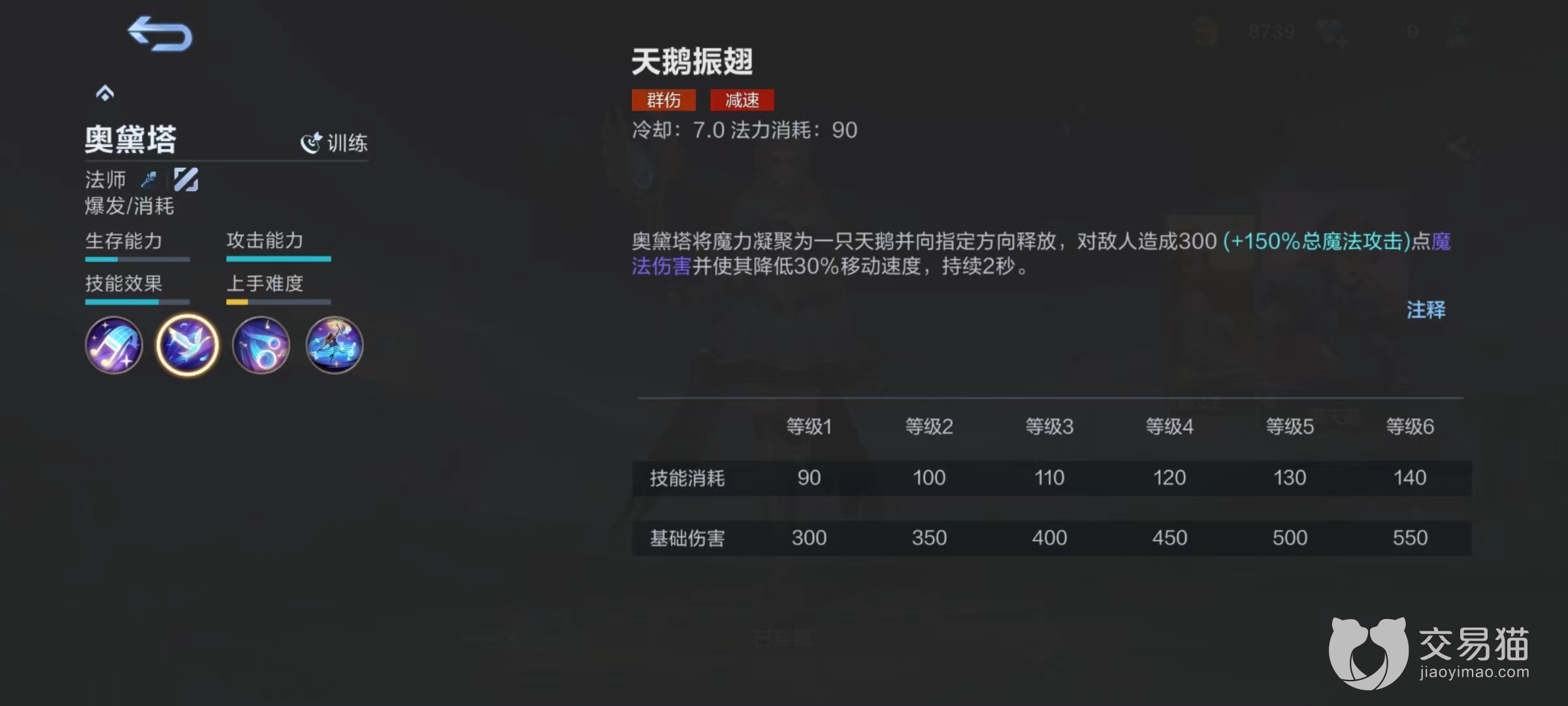 一技能天鹅振翅,将魔力凝聚为天鹅向指定方向释放,天鹅对接触到的敌人造成伤害并降低移动速度。技能使用简单效果都很出色,完全能够成为最佳消耗技能,在对线和团战时都很好用。二技能湛蓝之星,向前方释放魔法球,接触到敌人后造成伤害并将其禁锢起来,魔法球命中敌人后将会重新绽放出第2个法球,继续攻击附近敌人,优先选择英雄,对其造成伤害后同样进行禁锢。