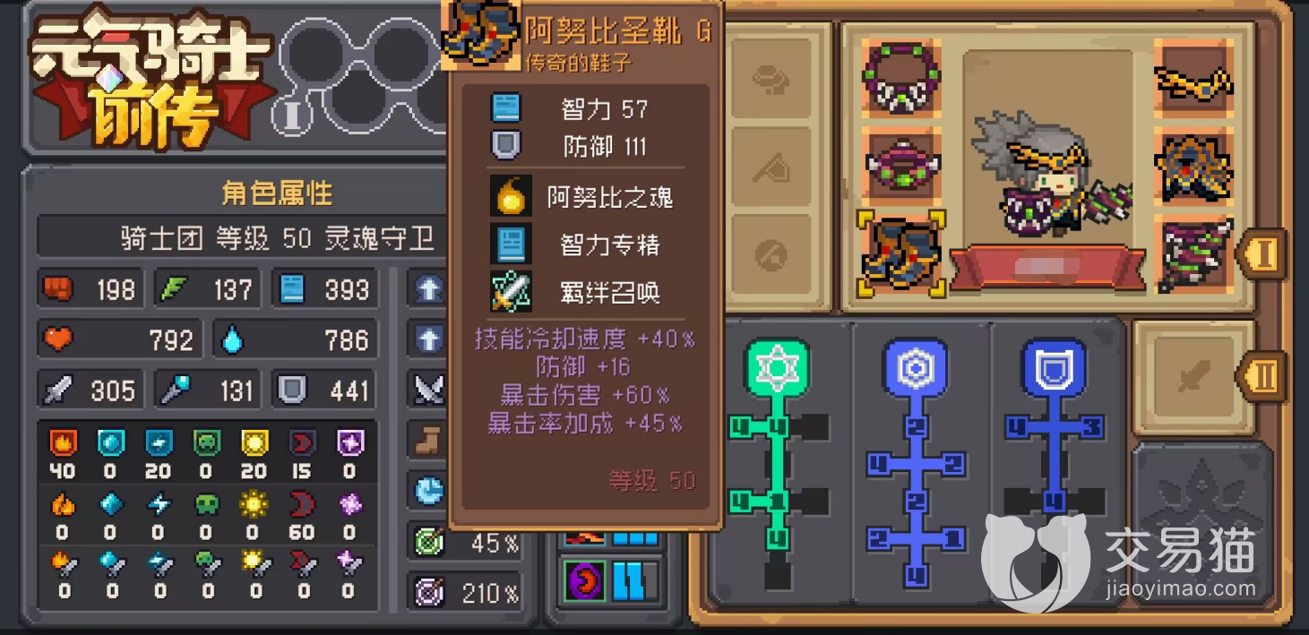 阿努比圣靴G:这是一把传奇品质的靴子,它的基础属性不错,有着57的智力和111的防御,对于法系职业有着很强的加持,另外它还有三项实用的能力,其中“阿努比之魂”可以在角色濒死时提供一次生命恢复,角色的保命能力大大提升,“智力专精”则给予了玩家额外智力,法系伤害得以进一步提升,然后“羁绊召唤”更是可以让你的召唤物继承装备羁绊效果,如此一来,召唤物的实力也得到显著增强。
