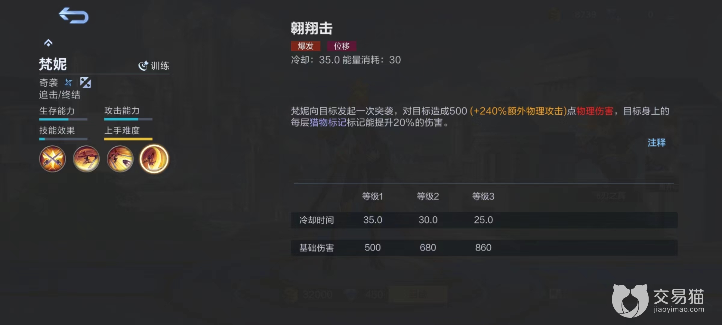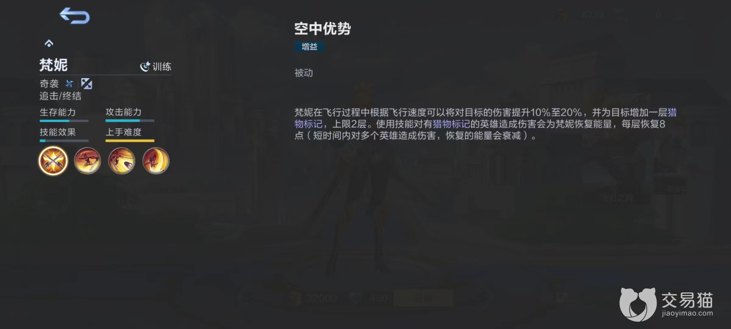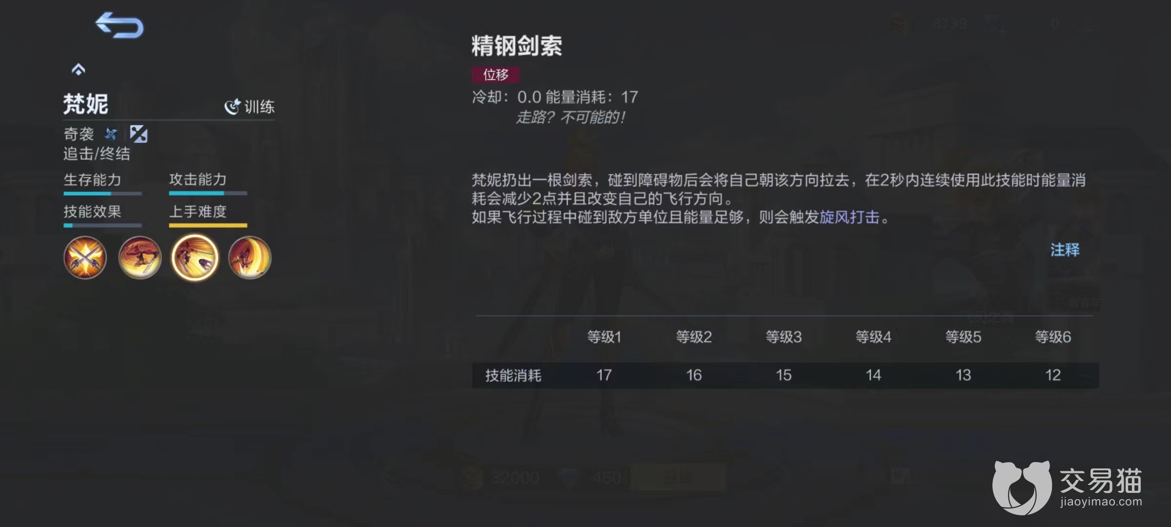 大招向目标发动突袭,造成伤害后目标身上每层标记都能提升20%伤害,也就是最多提高40%。该技能是对目标进行爆发和终结的关键,常用于连招最后一击,将对方直接带走。这些技能看似简单,但是难度就蕴含在使用方面,因为精钢剑索没有冷却时间,只要身上有能量可以持续飞行,这将全屏都能够看到梵妮身影,不过如何使能量满足需求就需要玩家合理操作。