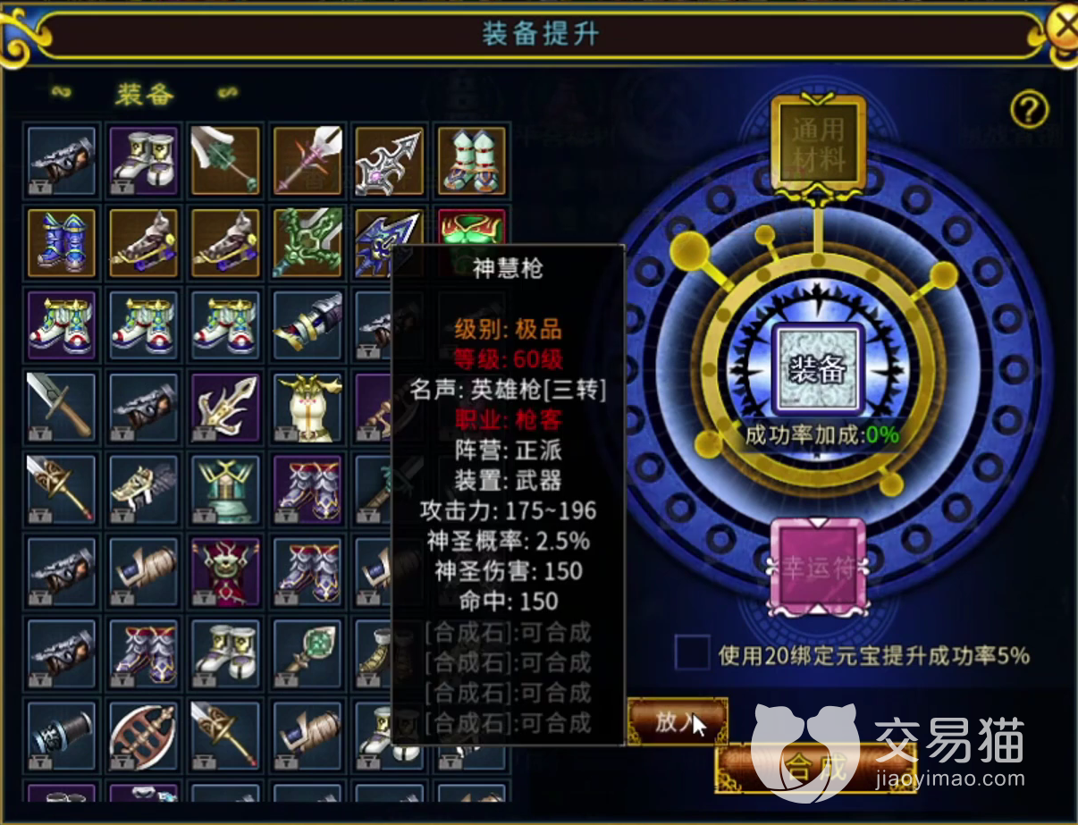 每一件装备通常情况下,可以一次性装配四个合成石。也就是说,每个装备如果想发挥出全部战斗力的话,至少得需要四次合成帮助我们提升战斗力。因此,对于合成石头装配来说,幸运符就是至关重要。毕竟如果在初期阶段装备合成时没有使用幸运符的话,很有可能会被游戏前中期较为难受的合成概率所困扰,继而导致不少装备装配合成时失败,浪费石头。当然,部分玩家们也可以选择用元宝进行提升强化成功率。