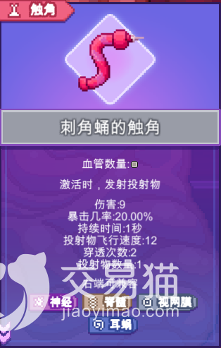 脊髓其实就是技能buff,玩家在每次通过一关的时候会出现脊髓功能选择,玩家需要选择合适的脊髓进入下一个关卡,脊髓的词条大部分都是比较容易懂的,比如说投射物数量,其实就是可以发射的子弹数量,激活频率就是每秒发射子弹的速度,其次就是暴击以及暴击伤害这种加伤的词条。