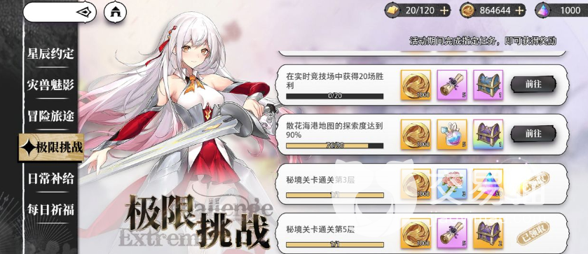 该游戏的活动有六个,分别是星辰约定、灾兽魅影、冒险旅途、极限挑战、日常补给和每日祈福。其中极限挑战是需要玩家们去提高地图探索度、完成实时竞技次数以及提高爬塔的层数等方面内容。