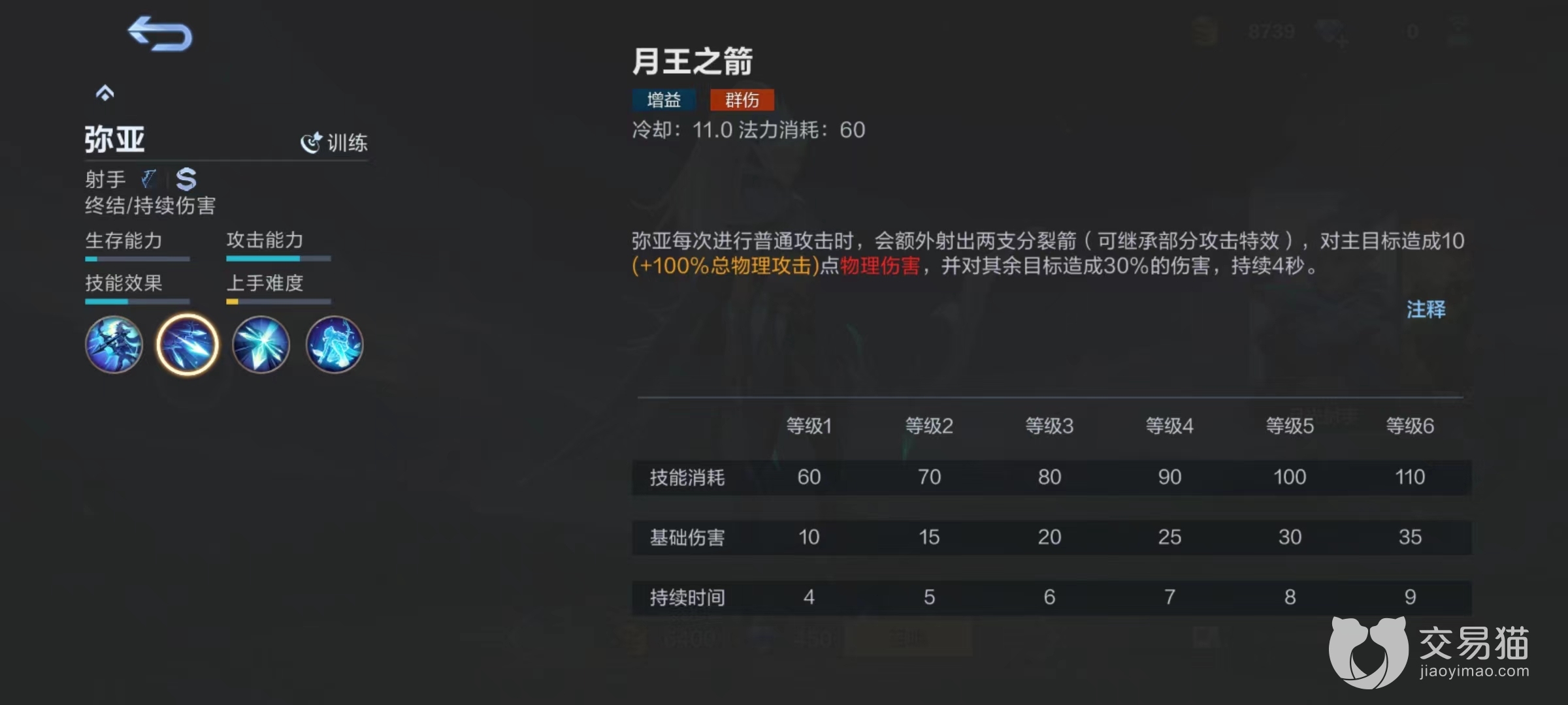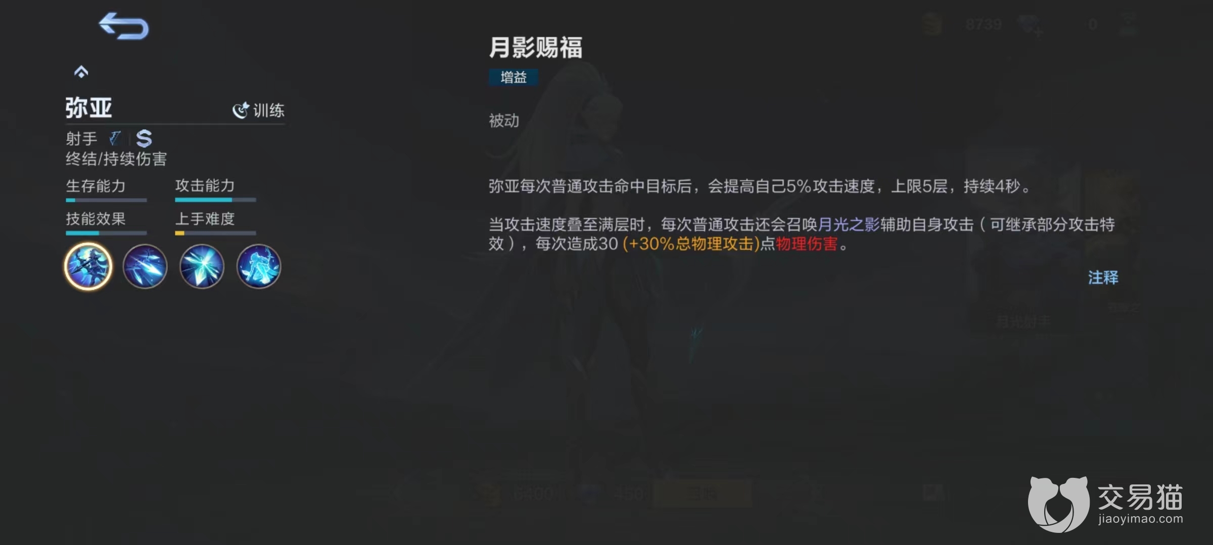 被动技能月影赐福,弥亚每次攻击命中目标后都会提高自身5%攻击速度,上限五层,也就是达到25%加成。当攻速叠加到满层时,普通攻击就会召唤出月光之影辅助输出,月光之影能继承部分攻击特效,虽然每次造成伤害并不高,但如果攻击特效给力,也是能有着意想不到效果。所以该进该角色在日常中就是不断保持自己输出频率,让身上的层数始终处于满层,这样能够持续享受加成。