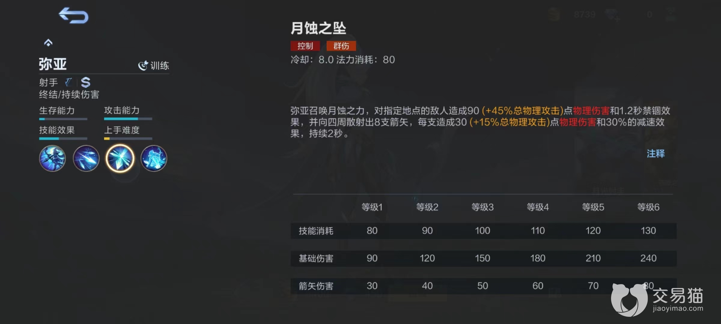 二技能月蚀之坠,召唤月蚀之力对指定地点进行物理伤害和1.2秒禁锢效果,同时向四周射出8支箭矢,每只都会造成物理伤害和减速效果。箭矢伤害并不算突出,但是群体减速之后有利于自身快速逃脱和进行走位,同时对指定地点敌人禁锢以后,是一个可攻可守的效果。既可以在这1.2秒内进行进行输出,又可以快速跑路,相信在后期神装情况下1.2秒时间完全可以将对方血量全部清空掉。