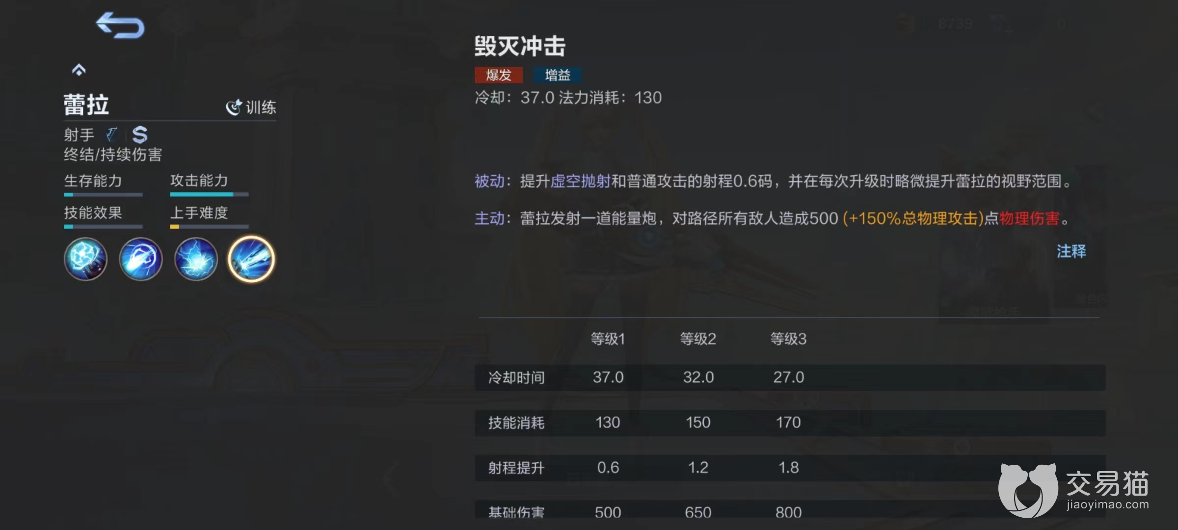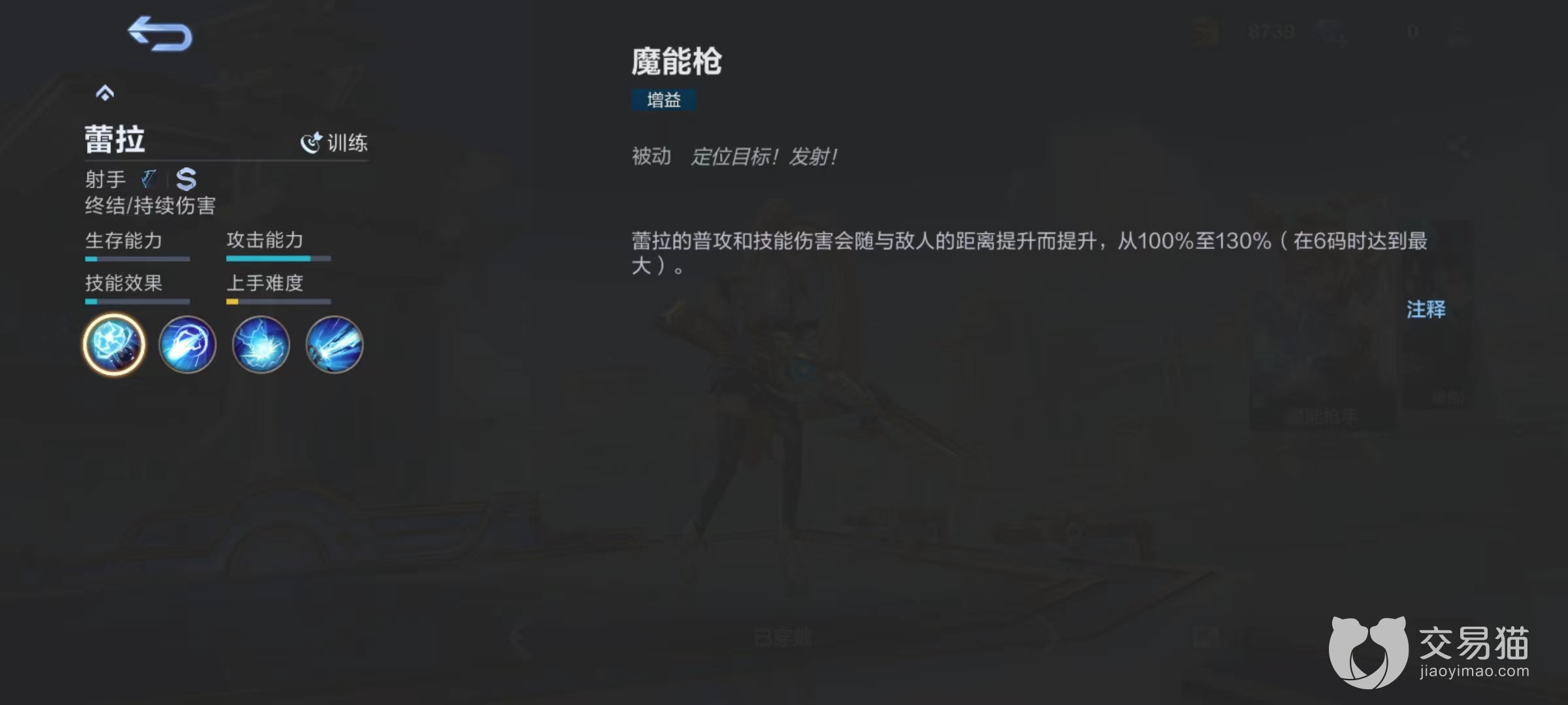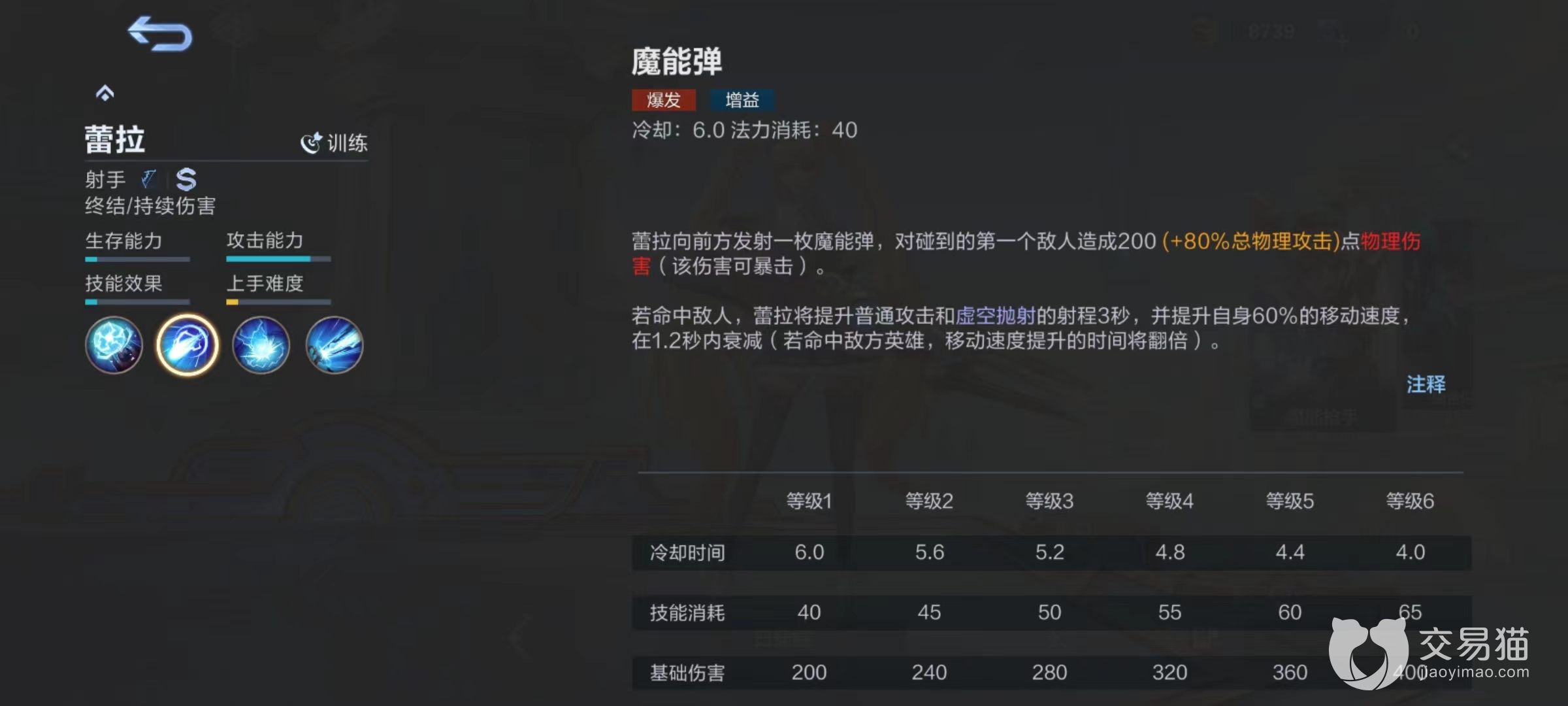 被动技能魔能枪,使蕾拉普攻和技能伤害会随着与敌人距离提升而随之提高,从100%~130%进行波动。所以在输出时候尽量注意自身走位和位置,能拉开距离就能够享受到更多加成,尤其是释放伤害比较出色的技能时更是如此。一技能魔能弹,向前方发射魔能弹,对碰到的第1个敌人造成物理伤害,并且能享受到暴击加成。如果成功命中敌人,蕾拉将提升普通攻击和虚空抛射射程,同时自身提高移动速度。