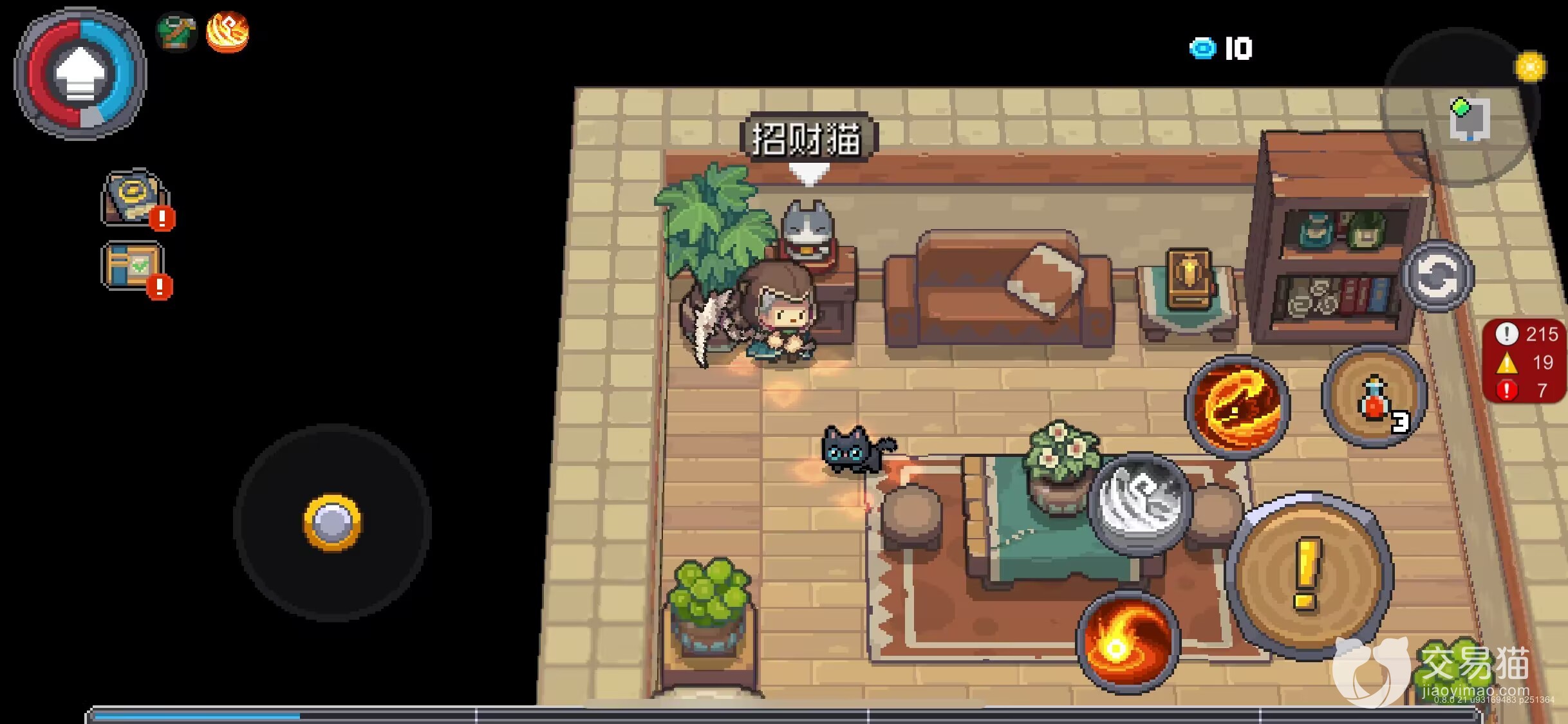 它的具体位置是在房间的左上角,需要玩家走到它前面之后才可以触发后续的功能,初期的时候,点击招财猫只能够收到一句似是而非的提示,提示的内容是说它似乎能够存放什么东西,结合上一代的内容其实不难猜测它的作用与氪金有关。