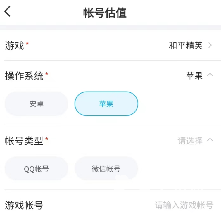 不过呢,考虑到部分玩家不太熟悉针对行情来进行价格判断,各位此时也可以使用交易猫app内的系统估值功能,大家进入到估价页面之后,只需要将账号的主要信息进行填写,随后就可以得到一个精准的交易数据,接下来即可顺利的在平台内进行出售。