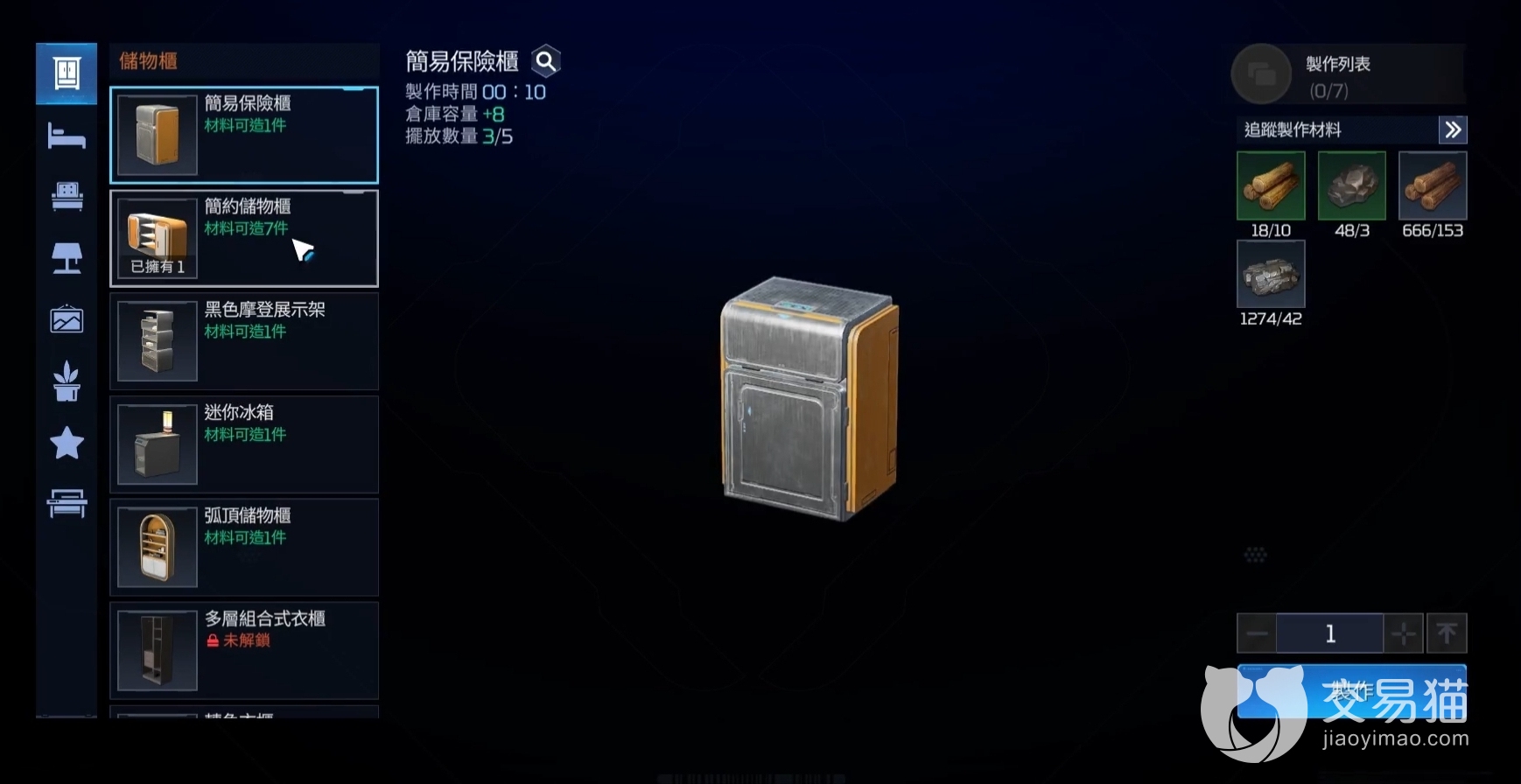 不过背包空间有限,还是要靠“仓库”来存货。在家园的家具制造台中有各式各样的储物柜家具图纸,或简约或摩登,兼具功能性和装饰效果的一类家具,建议大家尽早多做几个柜子,避免之后东西没地方放。