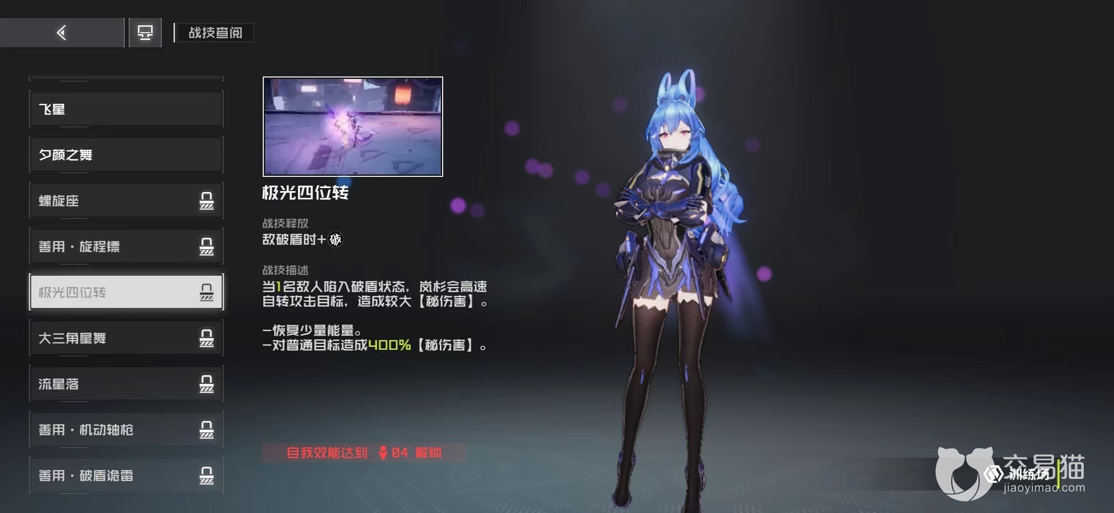 接下来的动作还有飞星,利用膝盖攻击敌人,夕颜之舞,施展绝技伤害前方大范围内目标,造成极高伤害,是非常强势的杀手锏。螺旋座,要消耗1/8能量才能释放,用腿法高速攻击面前敌人。极光四位转,当一名敌人被破盾之后,岚衫就会自动攻击目标,造成极高伤害还能恢复少量能量。大三角星舞,当敌方首领陷入到破盾状态时,连环飞踢并且将目标踩踏造成巨量伤害。流星落,当敌方有多名目标处于破盾状态时,连续采用飞踢形式攻击所有目标,造成大范围伤害,每命中一名敌人就能恢复少量能量。
