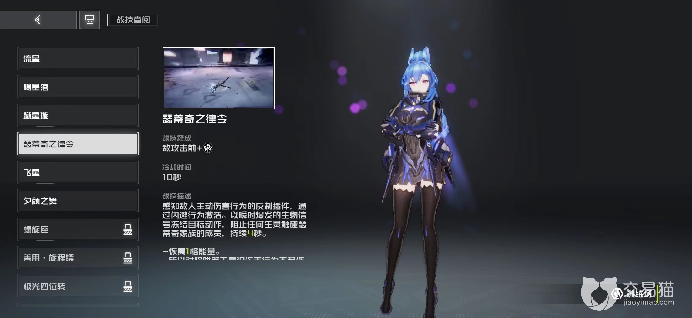 瑟蒂奇之律令,需要在敌方攻击到来前释放,使用之后10秒钟冷却时间,会感知敌人主动伤害行为然后进行反制,通过闪避进行激活,带来瞬间爆发,并冻结目标动作。能够阻止任何生灵触碰到家族成员,持续4秒钟,但是要注意的是对陷阱这样无伤害行为不能起到作用,使用之后可以恢复能量,是该角色极限躲闪技能,也是秀操作必备手段。