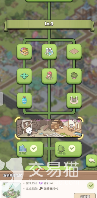 玩家们在地图等级等级到4级的时候就可以在右下角找到熊猫的图标了,点击图标后进入眼帘的是一个破破烂烂的小房子,房子内部需要玩家们完成一些任务,获取资源后进行翻新整改的,还需要在熊猫院子中解锁建筑,种植竹笋,但是前提是需要解锁【熊猫之家】,建造完成后会给玩家一些装饰材料和紫色水晶!