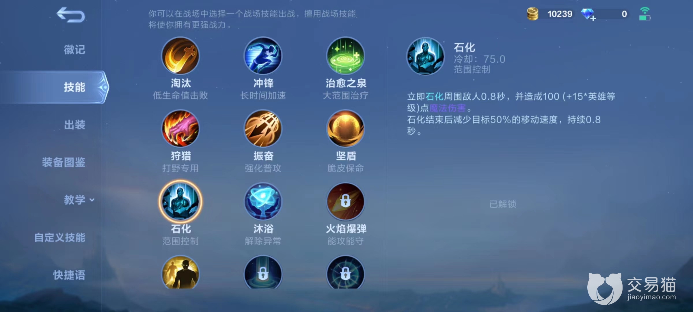 石化,将周围敌人石化0.8秒,并在结束之后减少移动速度,缺少控制英雄使用,还有辅助英雄能够携带,这样在关键时能够帮助射手逃生。沐浴,立即解除身上所有异常状态,并在接下来提高移速和短暂免控,战士和奇袭都合适。火焰爆弹,向指定方向发射一枚火焰弹,造成魔法伤害随着距离增加而提高,在发射时还可以击退近距离敌人,适合法师选择,该技能可以当做终结技使用,对方如果血量不高可以直接利用火焰爆弹远距离击杀。