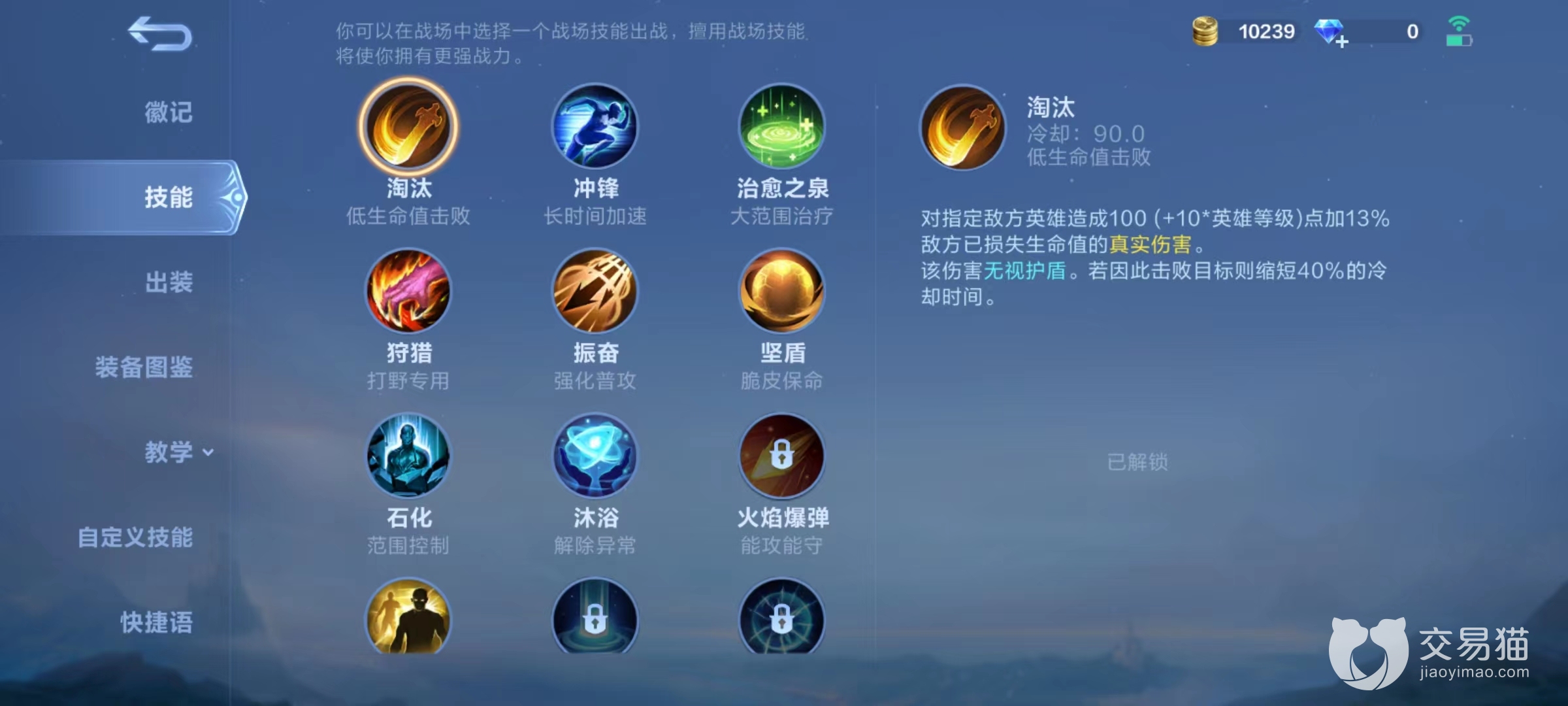 目前游戏中一共提供了21个不同战场技能可以使用,其中绝大多数一开始就已经解锁,还有一些需要后续花费钻石来付费解锁,但价格非常便宜,相信绝大多数玩家都可以轻松获得。接下来就详细看下具体有哪些,又将带来怎么样的效果。淘汰,对指定敌方英雄造成真实伤害,和对方已损失生命值相关,该伤害无视护盾,如果利用淘汰击败目标,则缩短40%冷却时间,适合奇袭、战士这样输出型角色选择,用于连招最后时刻快速斩杀目标。