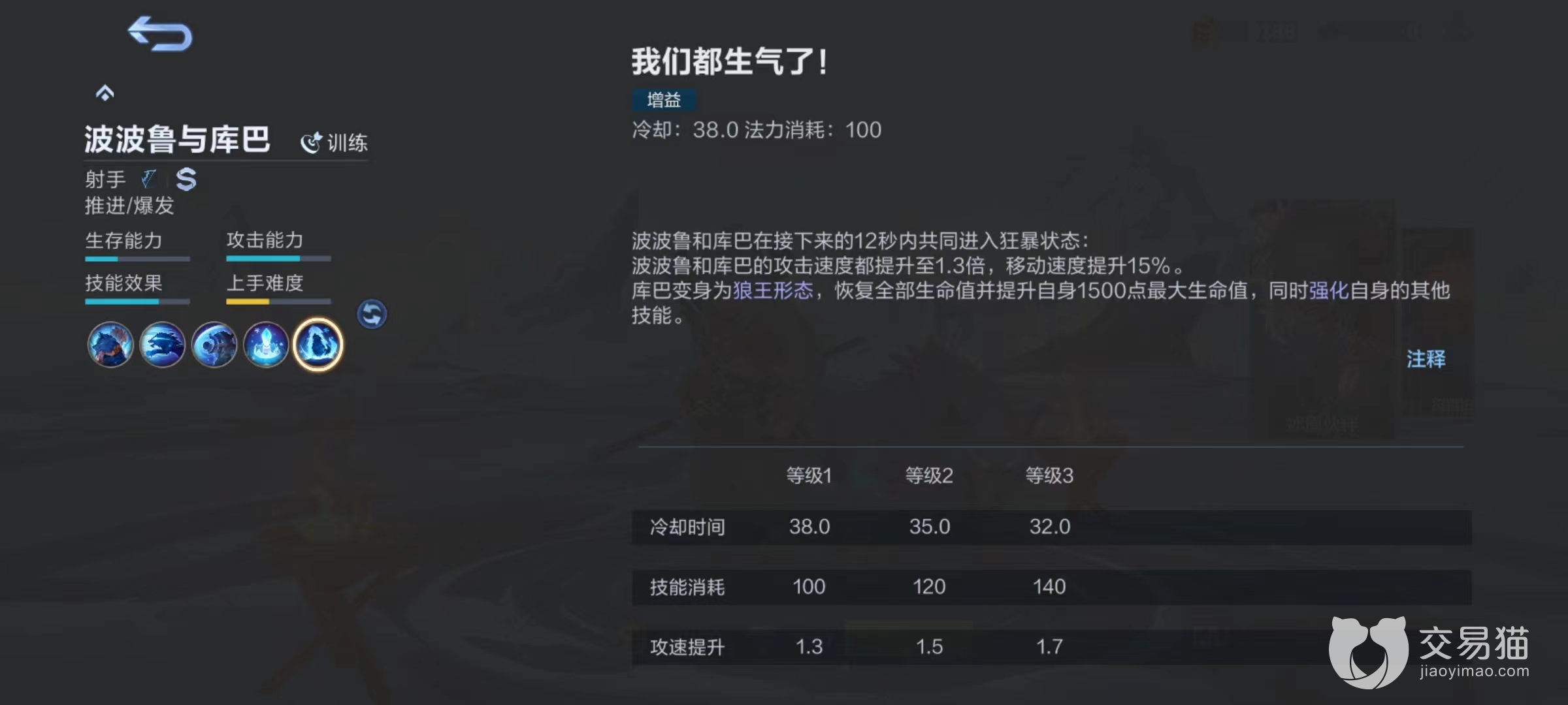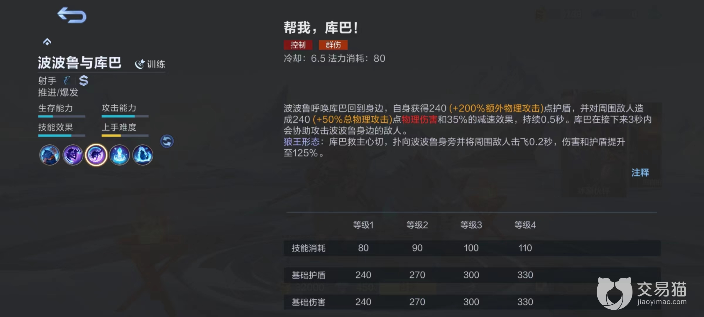 这是因为库巴有着对野怪的额外伤害,所以该英雄完全可以在清理线上资源的同时去野区狩猎,能够很快将野怪打掉,这样发育起来更加迅速。一技能效果为向目标投掷长矛作为信号,造成少量伤害后库巴上前撕咬目标,持续攻击三秒钟。二技能为将库巴召唤到身旁获得护盾,并对周围敌人造成伤害和减速,接下来将会协助攻击波波鲁身边敌人。也就是该角色绝大多数伤害都是由伙伴来造成,主人只起到召唤和指挥作用。