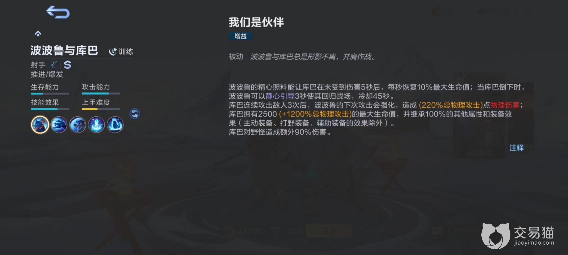 被动技能我们是伙伴,在波波鲁精心照料下,如果库巴5秒钟之内没有受到伤害,则接下来每秒钟恢复10%最大生命值。当库巴倒下的时候,波波鲁静心引导三秒钟使其重新回归战场,也就是宠物被击败可以重新引导再次回来继续战斗,但有45秒冷却时间。库巴连续攻击敌人三次后,波波鲁下一次攻击将会被强化,库巴拥有的生命值和物理攻击力相关,并继承其他属性和装备效果,库巴攻击野怪能造成额外90%伤害。