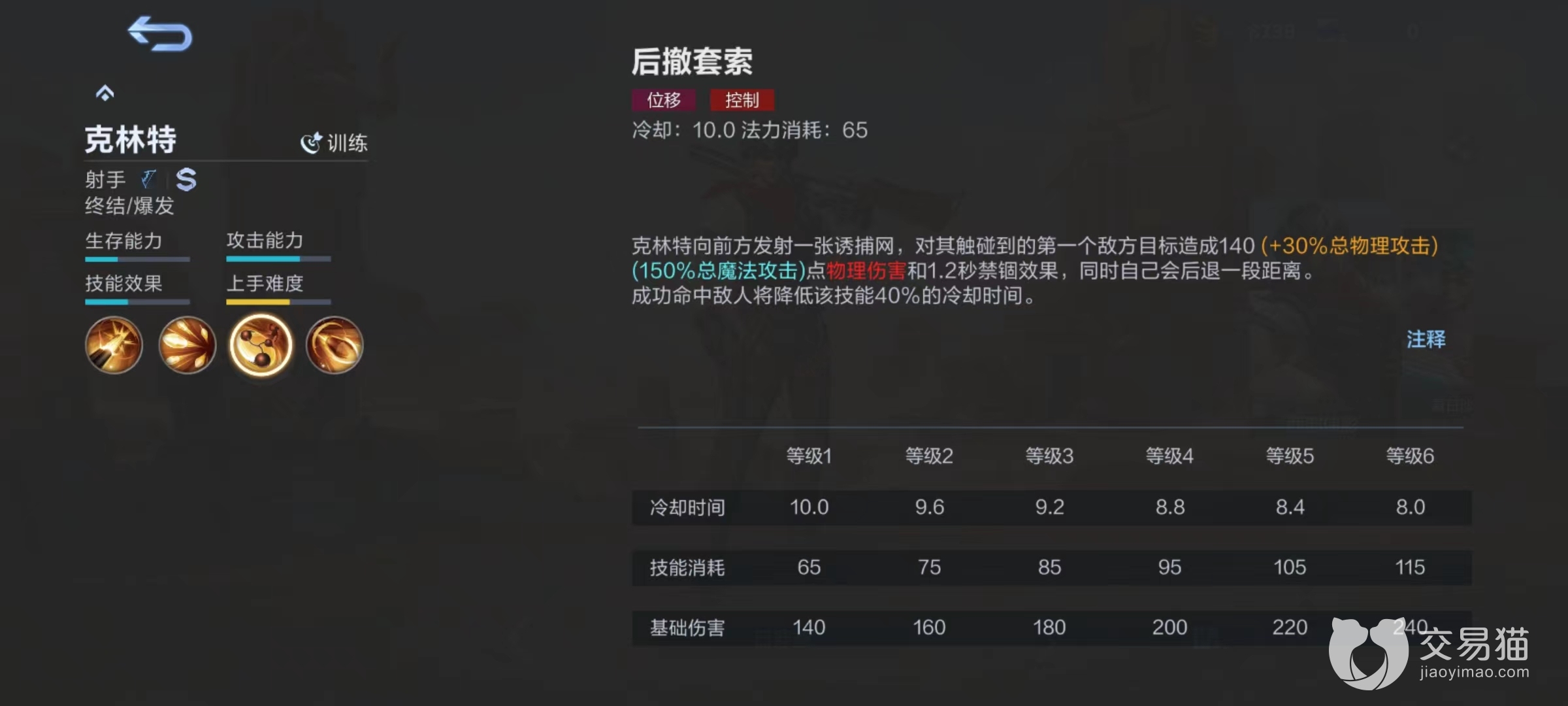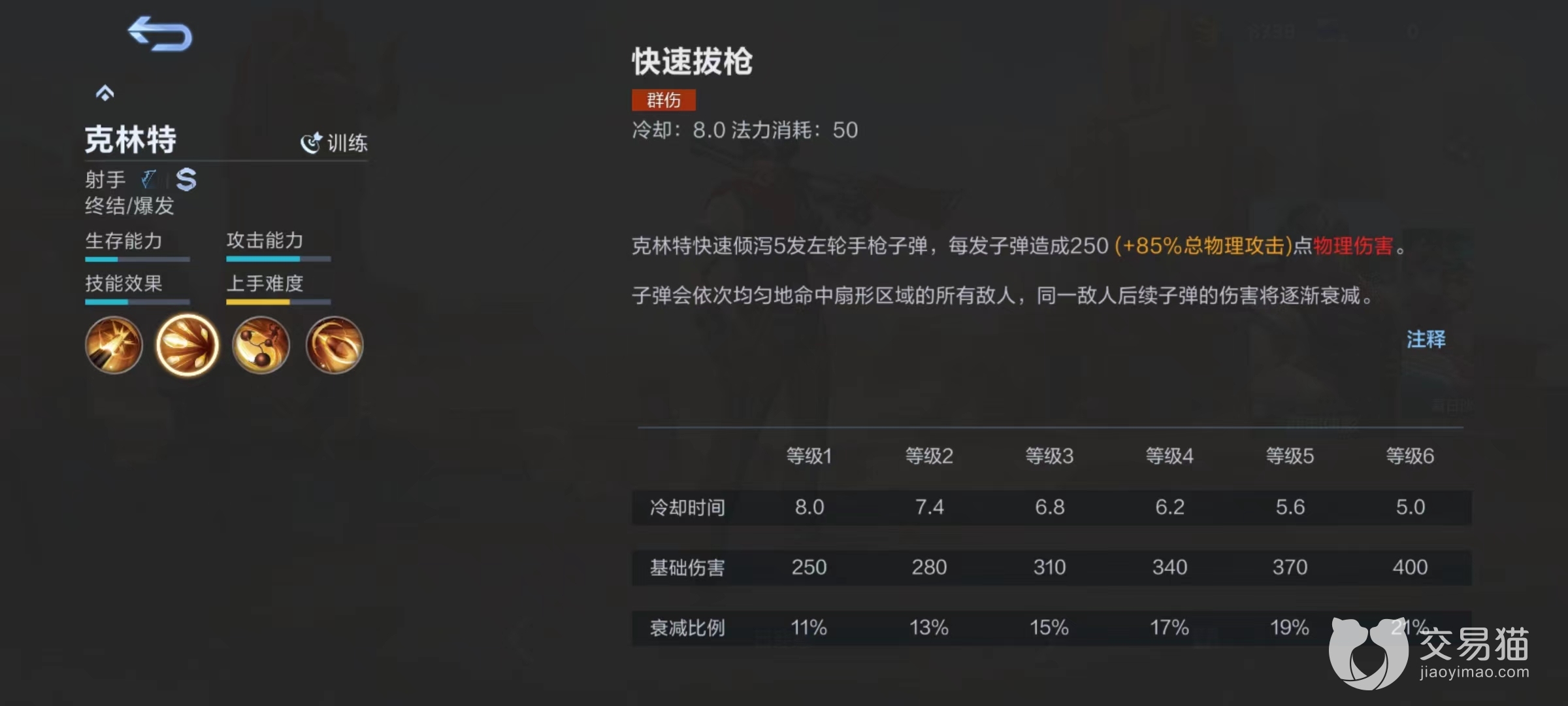 一技能快速拔枪,快速将手中左轮手枪子弹全部倾泻出去,一共有五发,子弹会均匀命中扇形区域内所有敌人,如果同一名敌人被多枚子弹命中,伤害逐渐衰减。无论是线上用于清兵或者是日常消耗都很好用,团战时也是常用消耗技能,最重要的是可以触发普攻。二技能后撤套索,向前方发射一张网,触碰到敌方目标后造成伤害和禁锢效果,自己同时会向后退一段距离,如果该技能成功命中则降低40%冷却时间。该技能达到满级时冷却时间只有8秒,再降低40%加上其他装备冷却就可以保证更频繁使用。
