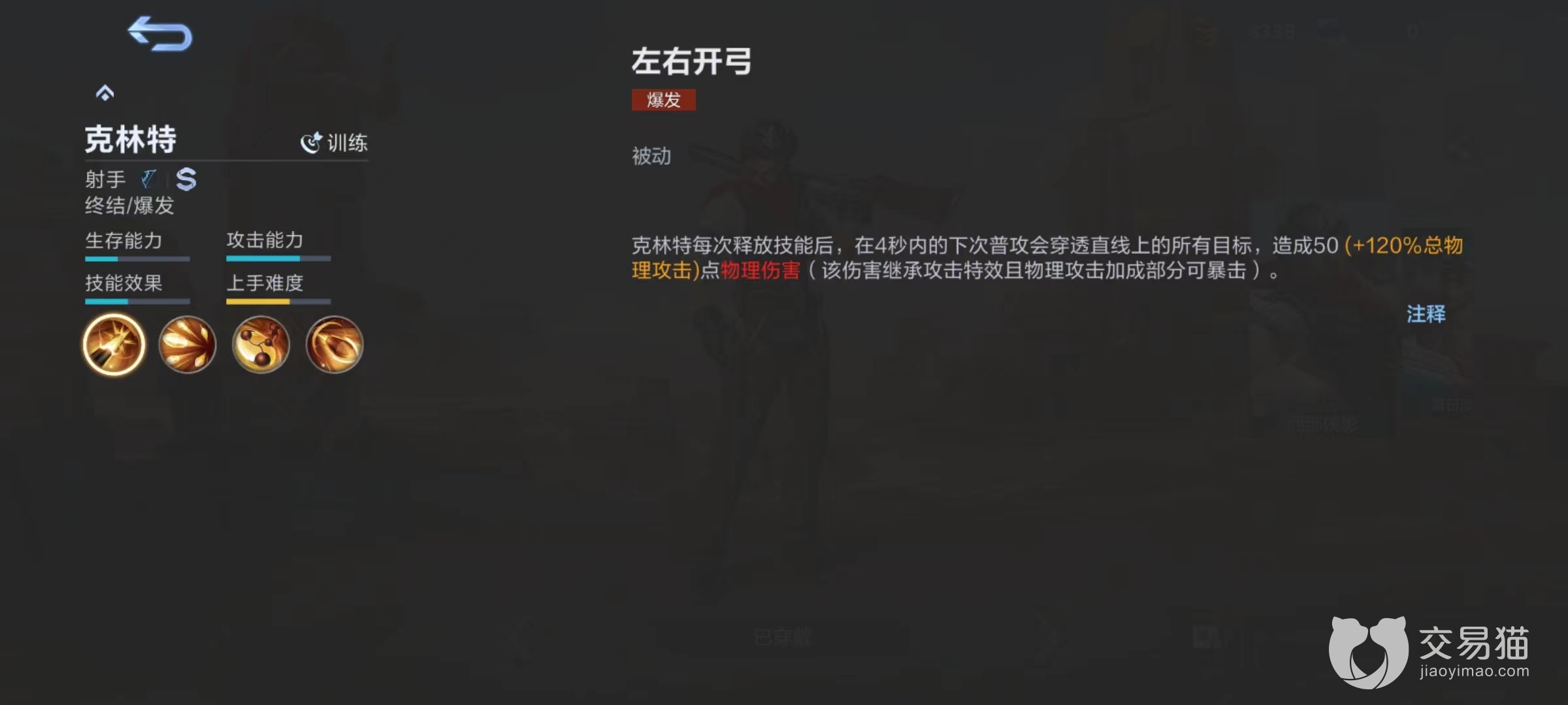 被动技能左右开弓,克林特每次释放技能后,在4秒内使用下一次普攻会穿透直线上所有目标,造成额外物理伤害。该伤害可以继承当前拥有的攻击特效,并且享受暴击加成。在连招技能过程中穿插普攻,并且利用穿透效果去消耗线上敌人和清兵是非常关键技巧,这些细节累积起来就能打出优势。