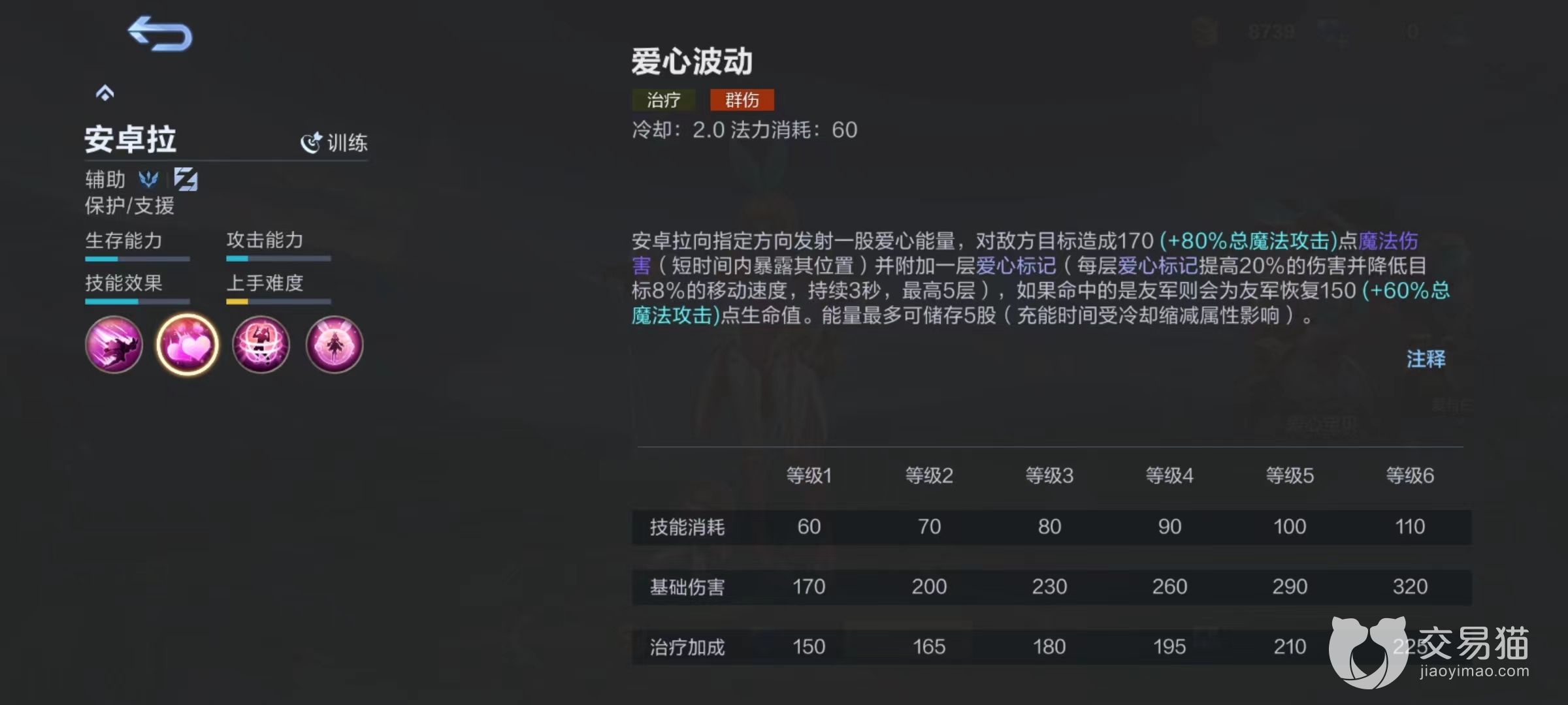 一技能爱心波动,向指定方向发射一股爱心能量,对敌方目标造成魔法伤害,并且暴露其位置,同时附加一层爱心标记。每层标记提高20%伤害,并且降低目标5%移动速度,最多叠加到5层,每层施加后持续三秒钟。要想叠加上来就要保证技能频繁命中,如果命中的是友方英雄,则为友军恢复生命值,该能量最多可以储存5枚。每次使用之后有两秒钟冷却时间,还可以通过其他效果缩减,完全能够在命中对方以后叠加起来,只要手速够快。