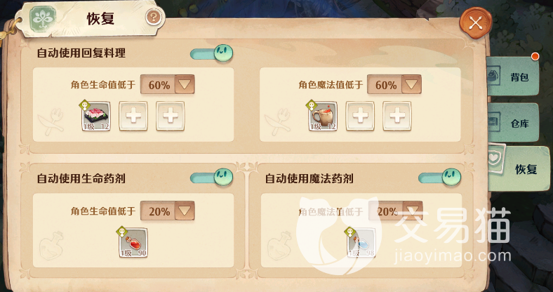 在进入游戏后点击游戏中的【背包】选项,在右侧就可以看到【恢复】页面了,玩家们可以设置四个选项,一个是自动使用回复料理:角色生命值低于60%的时候可以装备三种不同的回复物品。角色魔法值低于60%的时候同样可以装备三种不同的物品。
