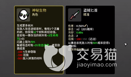 它在强度上面跟大家之前玩过的和平主义这个角色非常类似,这是一个前期战力非常高的角色,后期也可以拿到钱不,过在在使用这个神秘生物的时候大家会发现跟和平主义者不一样的是,这个角色其实在前期跟后期的强度都差不多,因为在属性上面它是可以通过闪避来增加自己容错操作的,而他的第一个技能就是可以带来更多的树木,这样大家前期获得了伐木斧这个工具的话,他就可以使用这个技能带来更多的树木。