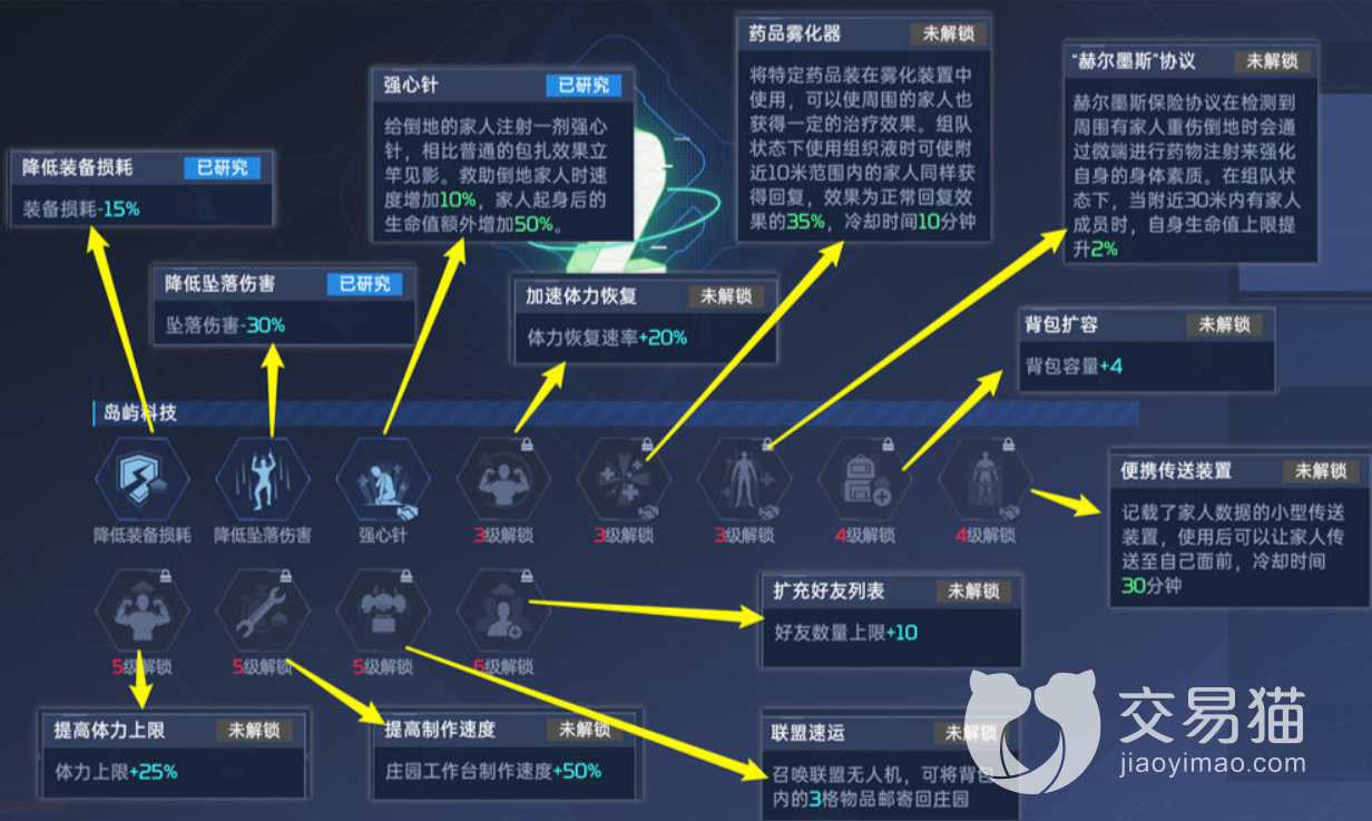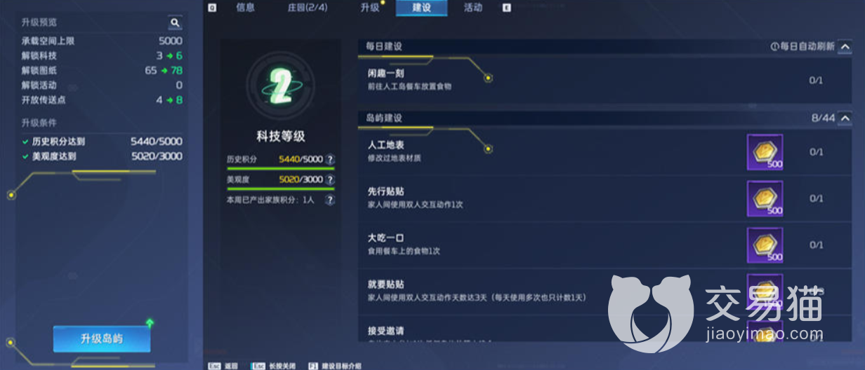 人工岛不仅仅是玩家们的庇护所,通过提升岛屿等级,可以解锁相应的岛屿科技来为此岛屿的居民提供增益效果,使得玩家可以更好的进行探险,并且使得玩家对人工岛的玩法重视起来。