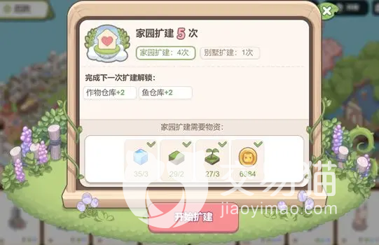 玩家们点击右下角的建造就可以进行扩建了,庭院的扩建是需要消耗一些开荒材料的,比如泥土、树木、还有水,最后在使用金币就可以了,建造过程中需要花费一些时间。而别墅扩建则需要消耗更过的竣工材料,如水泥、木板、钢铁、玻璃,两种不同建造所需要的材料可以通过等级树升级奖励、竹子商城、活动、市场等地方获取,等不及的话可以直接使用钻石进行购买。