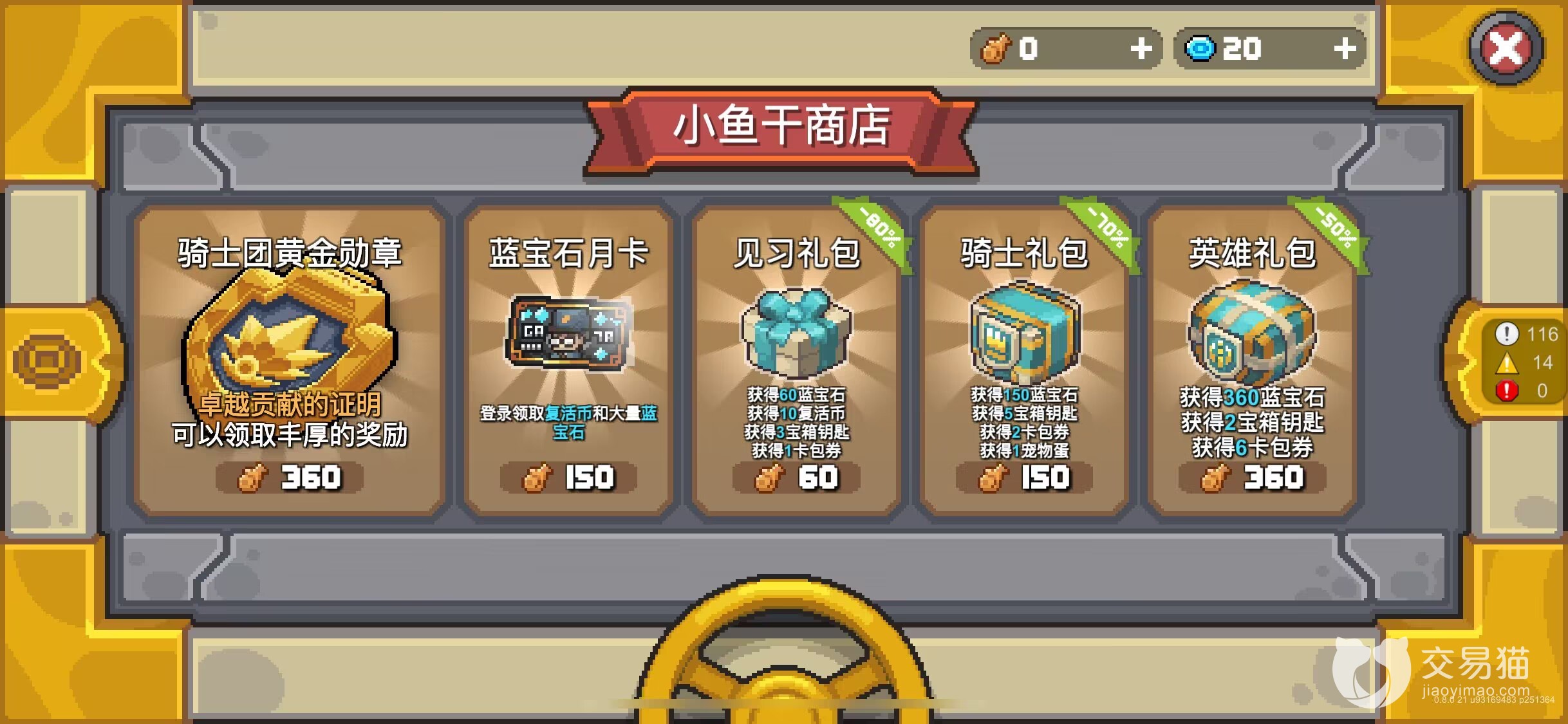 小鱼干商店:该商店通过正对门口的大猫进入,点击大猫后你会跳转到一个独立的页面,这是专门针对小氪玩家推出的福利商店,里面售卖三个礼包,一张月卡,以及一个骑士团的黄巾勋章,其中礼包会直接提供蓝宝石,宝箱钥匙,卡包券,宠物蛋和复活币等奖励。