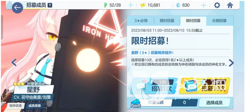 现在就是我们经常抽卡的常规卡池了。三星角色大概能够产出的角色卡牌的概率为3%。概率较低。但是二星和一星角色会比较高一点,毕竟是常规卡池嘛。新角色大概能抽中的概率为78.5%,而二型角色为18.5%,所以如果想要在常规卡池中抽取到三星角色,还是比较困难的。在抽卡时,小编比较建议一次性招募十次。一发入魂的概率实在是太低了。