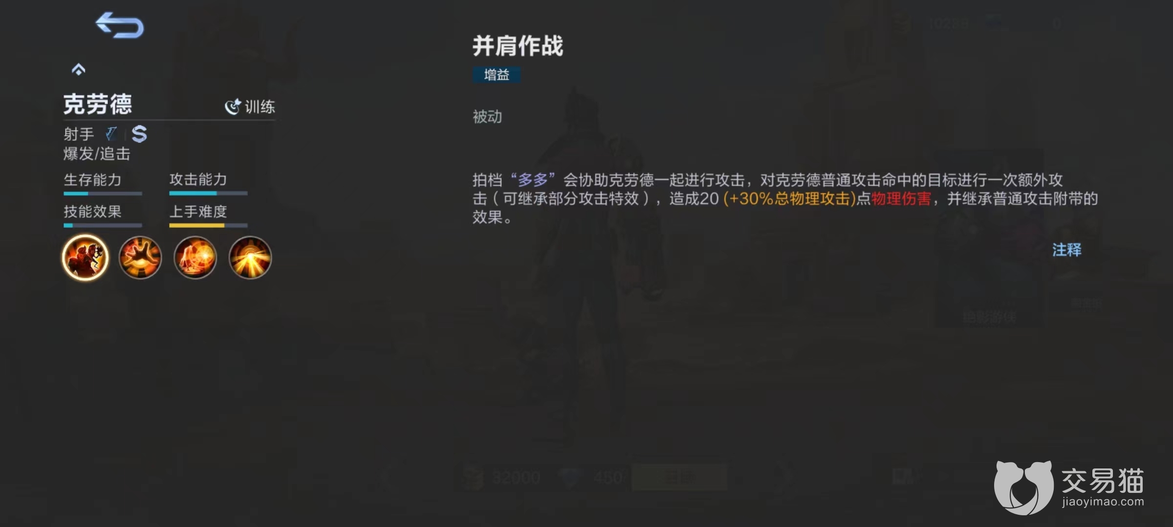 被动技能并肩作战,他的搭档多多会协助进行一起攻击,克劳德命中目标后会额外再附加一次攻击,并且继承普攻附带各种效果。一技能伤害中等,关键在于附加的汲取效果,造成物理伤害后降低伤害目标移动速度和攻击速度。每命中一个单位,自身就能够增加4%移动速度和攻击速度,如果命中敌方英雄效果翻倍,最多叠加到5层。该技能是所有连招先手,释放之后才有足够属性去进行接下来的输出。