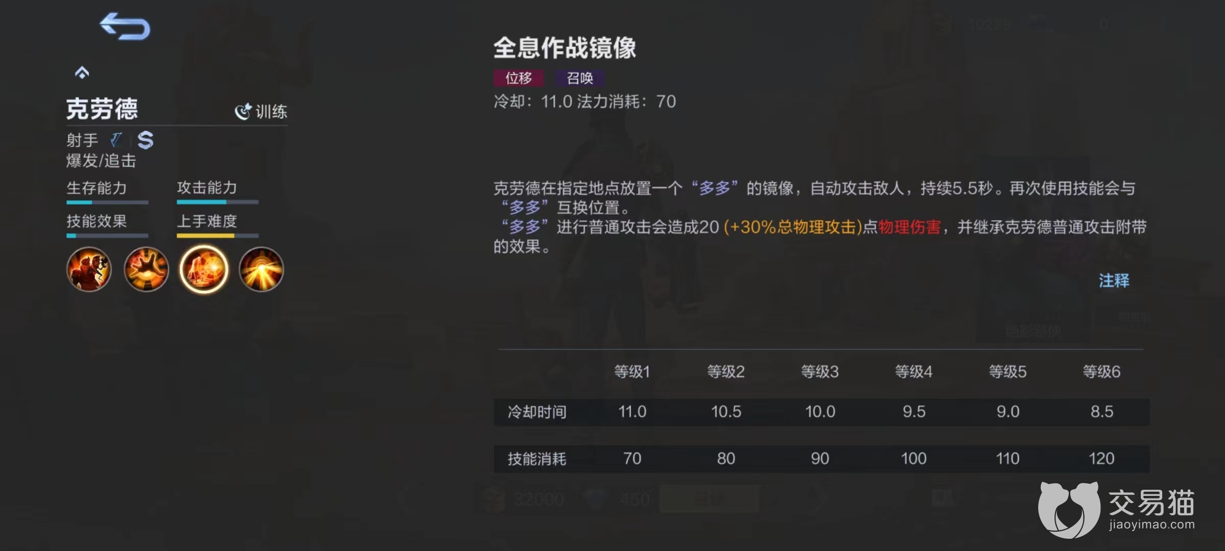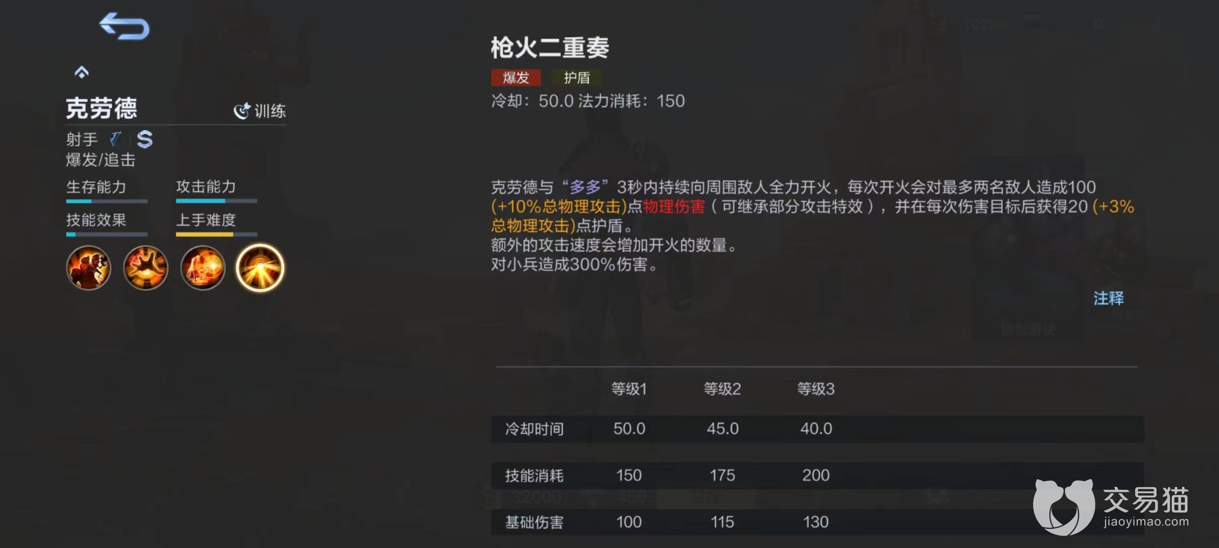 二技能在指定位置召唤出多多镜像自动攻击敌人,再次使用技能后多多将会和镜像互换位置。多多在进行普通攻击的候造成物理伤害并且继承克劳德普攻附带效果,所以在出装时候就要有所选择,尽量出那些能够有附加状态的装备,因为多多可以继承下来。大招枪火二重奏,克劳德与自己同伴多多全力向周围敌人开火,每次都会伤害最多两名敌人,并在伤害后获得护盾,额外攻击速度会增加开火数量,该技能对小兵有伤害加成。