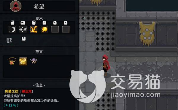 虽然在关卡前的配置阶段,也就是在广场我们可以前往商人那里购买解锁更多的符文,但其实只能够同时装备一个进入地牢关卡。但是在关卡中我们可以找到npc使用金币购买其他符文,而有一个npc出售的符文泛有不祥的红色光芒,这些是诅咒符文,虽然能够提供强大的加成效果,但本身也会带有减益效果。