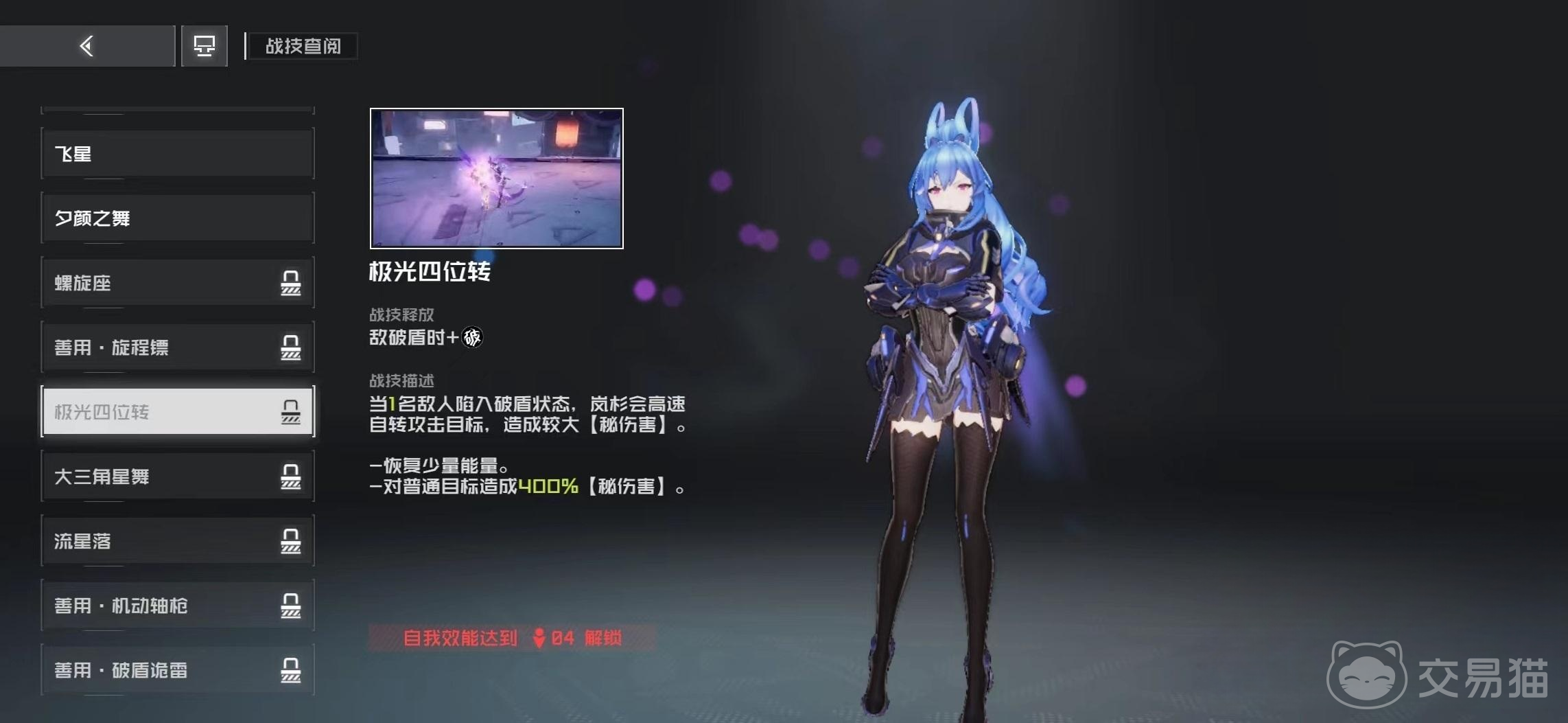 最后一个技能是“极光四位转”,它可以在你的敌人被破盾时施放,对付那些有破盾手段的敌人效果拔群,其本质上属于被动触发技能,触发后岚衫瑟蒂奇会去主动攻击这名被破盾的敌人,从而造成400%的“秘伤害”,这一伤害对付特定属性的敌人时还会形成克制效果,从而造成更多的伤害。