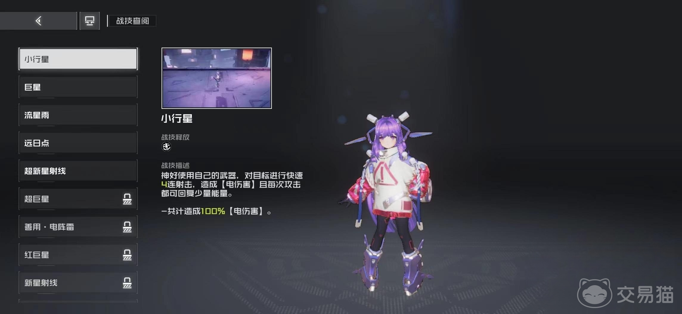 技能方面,她的一技能是“小行星”,作为其常规输出手段,该技能的效果也是相当简洁明了,使用后可以对目标进行四次打击,共计会造成100%的电系伤害,并且每次打击都会恢复少量能量。该技能的伤害倍率非常一般,一倍的输出对于众多角色来说,都是十分常见的。