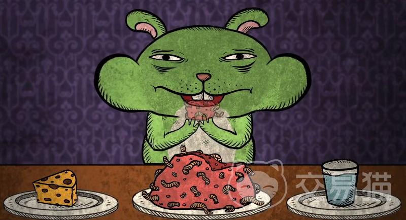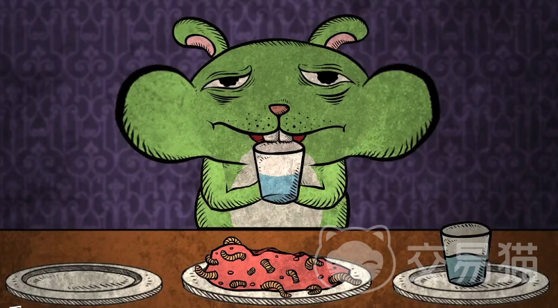 在这个关卡的画面中会出现一只绿色的松鼠,松鼠的前面摆放这三盘食物,第一个盘子里面装的是奶酪,而中间的盘子里面装的是红色的物体,堆成一座小山的样子,中间还有很多的虫子钻出来,右边的盘子里面放了一个杯子,杯子里面装了满满的一杯水。