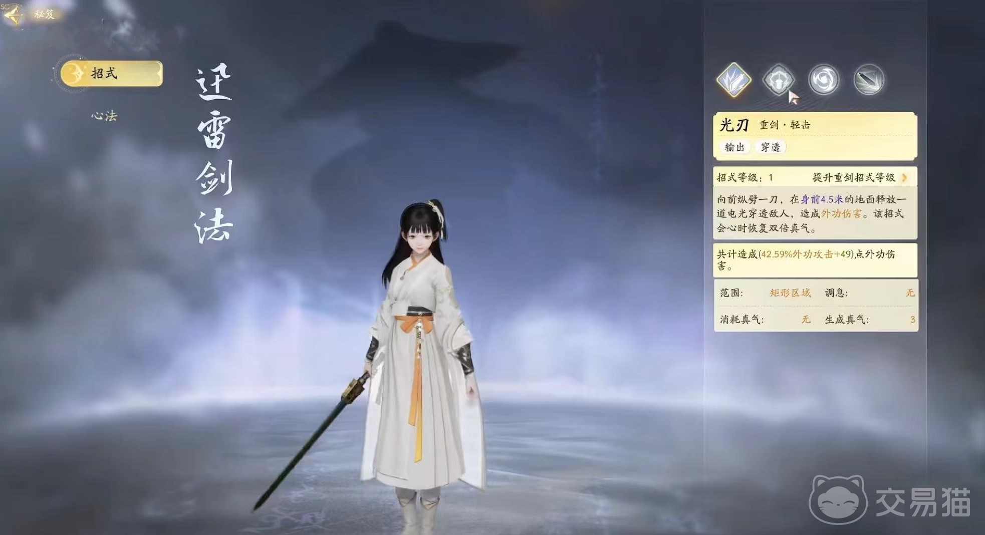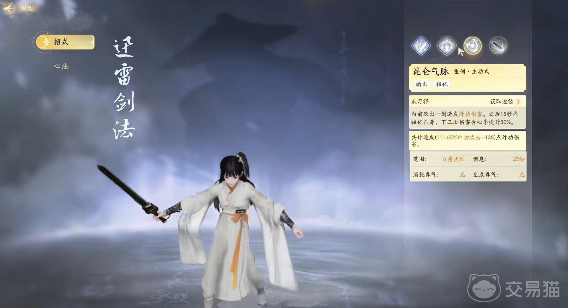 迅雷剑法的基础技能光刃,是个远距离输出技能可以造成外攻伤害;基础技能跃空劈,这是个跳起的技能,在落地时伴有迅雷剑气可以造成外功伤害;主动技能昆仑气脉,会有外攻伤害之外还能强化自身的会心率;绝技威临宇宙,除了有远距离的外公伤害之外还会在20秒内触发落泪造成额外的外功伤害。