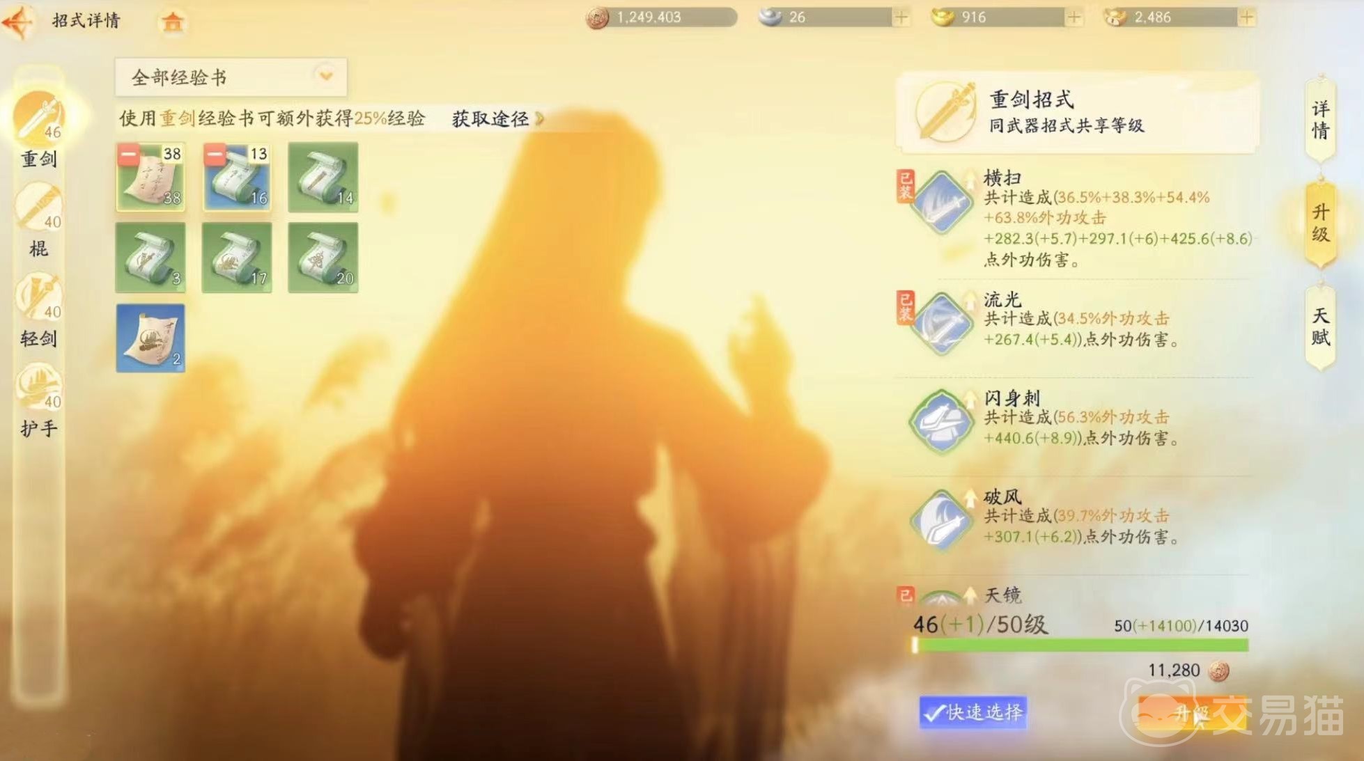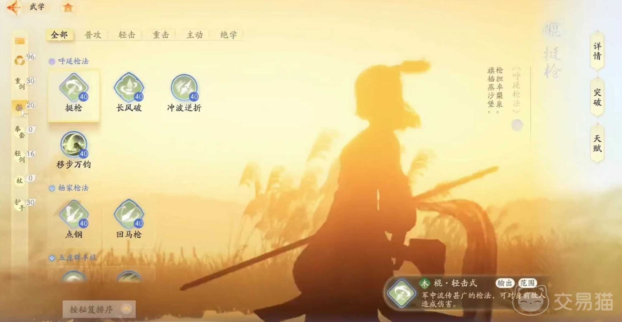 获得了武学之后那么就需要进行突破。不过这个游戏中的武学突破在设定上和其他游戏有一点不一样,他的武学突破是针对武器来说的,只要是这类武器进行突破之后,后续更换更高级的武器依然是已经突破好的等级,而且是全部技能招式全部进行突破和升级。