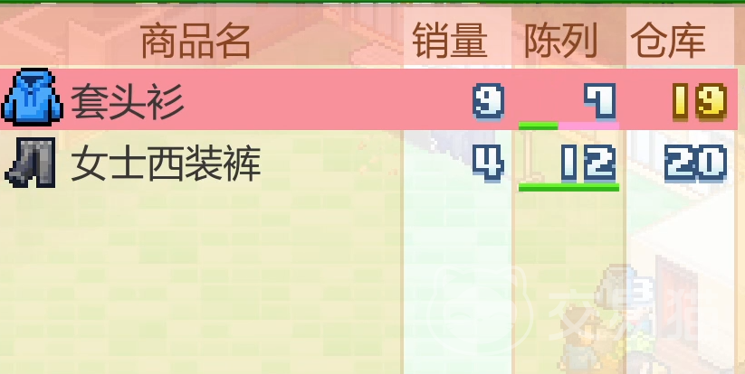 在最先开始,玩家们的店面只有一名店员,而商品也只有两件,分别为套头衫和女士西装裤。前期的服装仓库里面一般会存有25件左右,之后每一天会到货1-30件,具体的件数需要玩家们自己来进行设定。