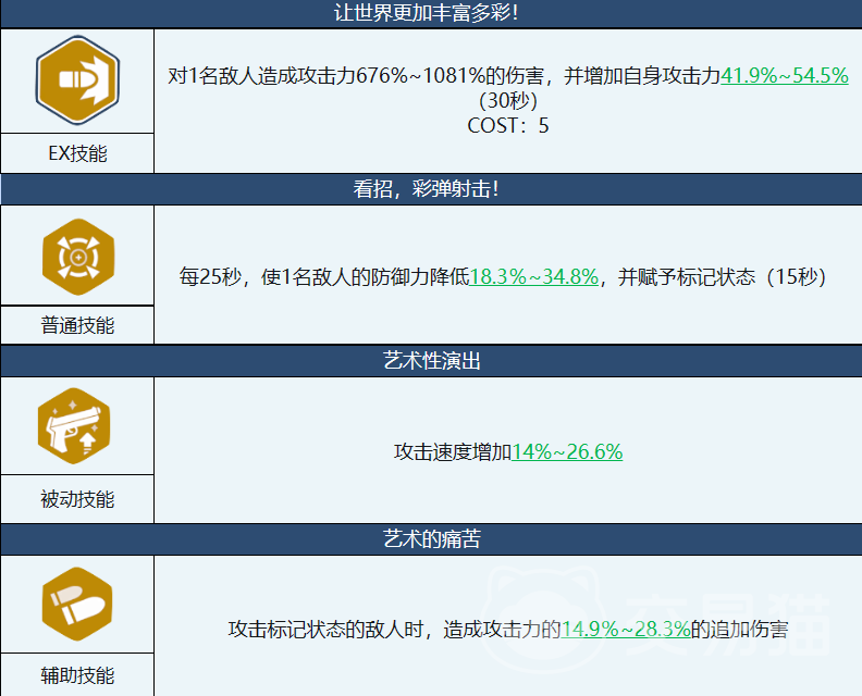 普通技(看招,彩弹射击!):这是真希的辅助技能,它可以选择一个敌人,降低其防御力,并且给予15秒的标记状态。这个技能的CD时间为25秒,所以需要注意与EX技能的配合,尽量在EX技能释放之前使用普通技能,以增加伤害效果。被动技(艺术性演出):这是真希的基础技能,它可以提升自身的攻击速度。这个技能可以让真希更快地积累COST,并且增加普通攻击的输出。辅助技(艺术的痛苦):这是真希的特殊技能,它可以在普通技上的标记buff来触发追加伤害。这个技能可以让真希对标记目标造成更多的伤害,并且还能引爆标记,对周围敌人造成范围伤害。