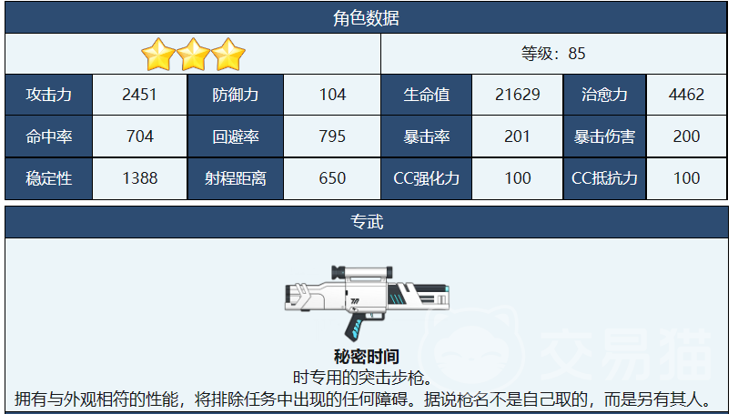 值得注意的是时是一位常驻角色,也就是说你可以通过常规方式获取她的碎片和爱用品,让她更容易达到高练度和高专精。