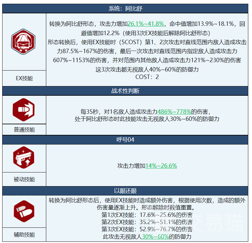 我们就先来看看时的技能,首先是普攻,能对敌方单体造成物理伤害,并降低其暴击伤害抗性。EX技:消耗1点EX值,对敌方单体造成物理伤害,并增加自身暴击率和暴击伤害。主动技也会消耗2点SP值,但是能对敌方单体造成不错的物理伤害,并增加时的攻击力。被动技,则是时的核心输出技能了,每次普通攻击或EX技能命中敌人时,增加自身攻击力。