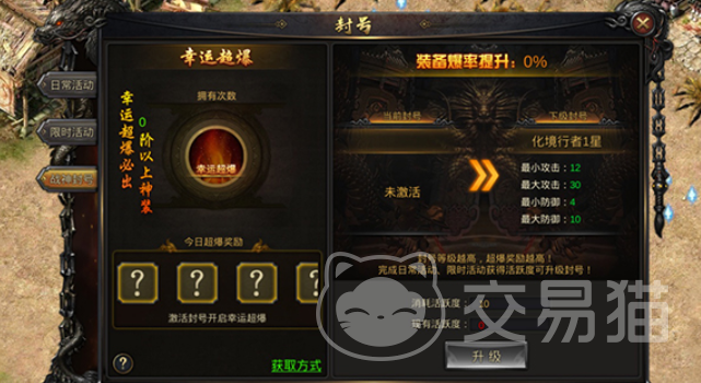 到时候完成日常活动和限时活动后,将我们的活跃度升上来,提升我们的封号等级,加上各类型道具的辅助,可以让玩家们尽情享受到装备爆率方面的提升。