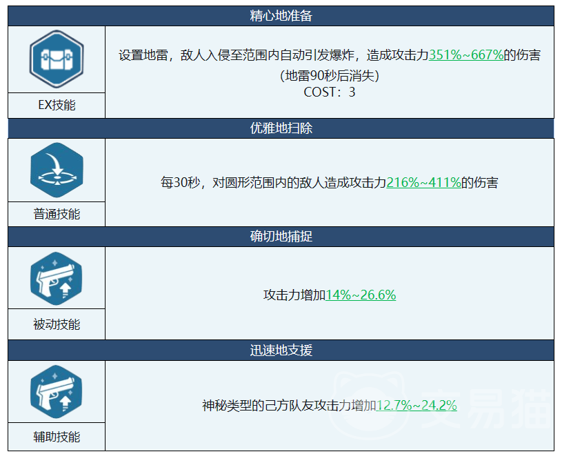 朱音兔女郎的技能不叫注重输出与aoe,朱音兔女郎平a会向前方射出一颗子弹,对命中的敌人造成朱音兔女郎攻击力100%的伤害。EX技名为精心地准备:朱音兔女郎会在战斗地图上放置一枚地雷,当敌人们踏入地雷范围内时,地雷将延时爆炸,对敌人造成朱音攻击667%的输出!