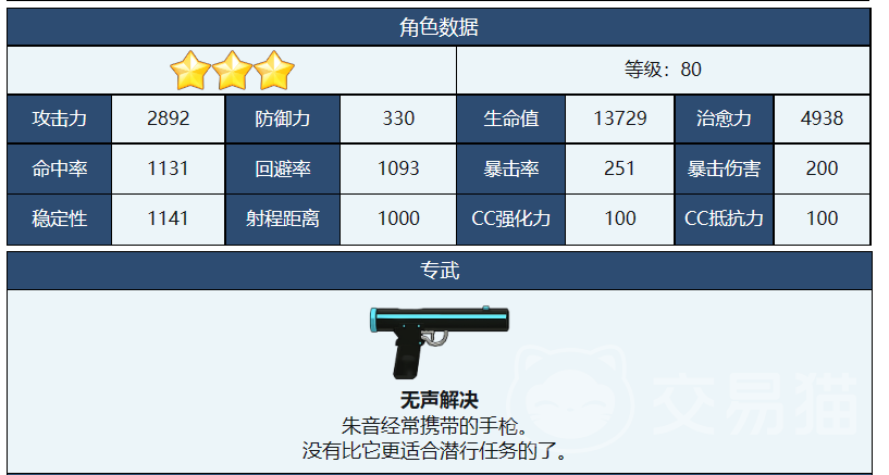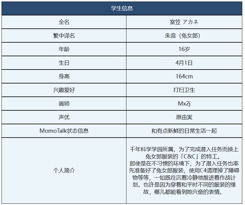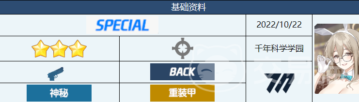 朱音兔女郎是一位属于前年科学的学生,她的武器是手枪,攻击距离为中等,攻击速度为较快。她的属性为神秘属性,对一般属性敌人有伤害加成,对神秘属性敌人有伤害减免。她的初始星级为3星,最高可升至5星。她的初始好感度为0,最高可达100。