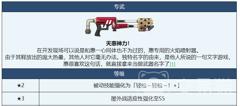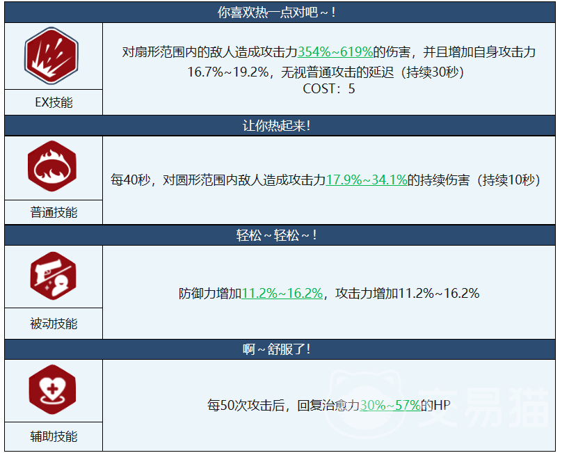而惠的专武与惠技能也是相辅相成的,我们再来了解下惠的技能。EX技:你喜欢热一点对吧~! 对有限范围内的敌人打出攻击力 354%~619% 的aoe,并且同时增加自身攻击力16.7%~19.2%,无视普通攻击的延迟(持续30秒) COST:5普通能:轻松~轻松~! 防御力增加 11.2%~16.2% ,攻击力增加 11.2%~16.2%。被动技:啊~舒服了! 每50次攻击后,回复治愈力 30%~57% 的HP。辅助技:场地适应性分别:屋外、屋内、市街:S、B、D。